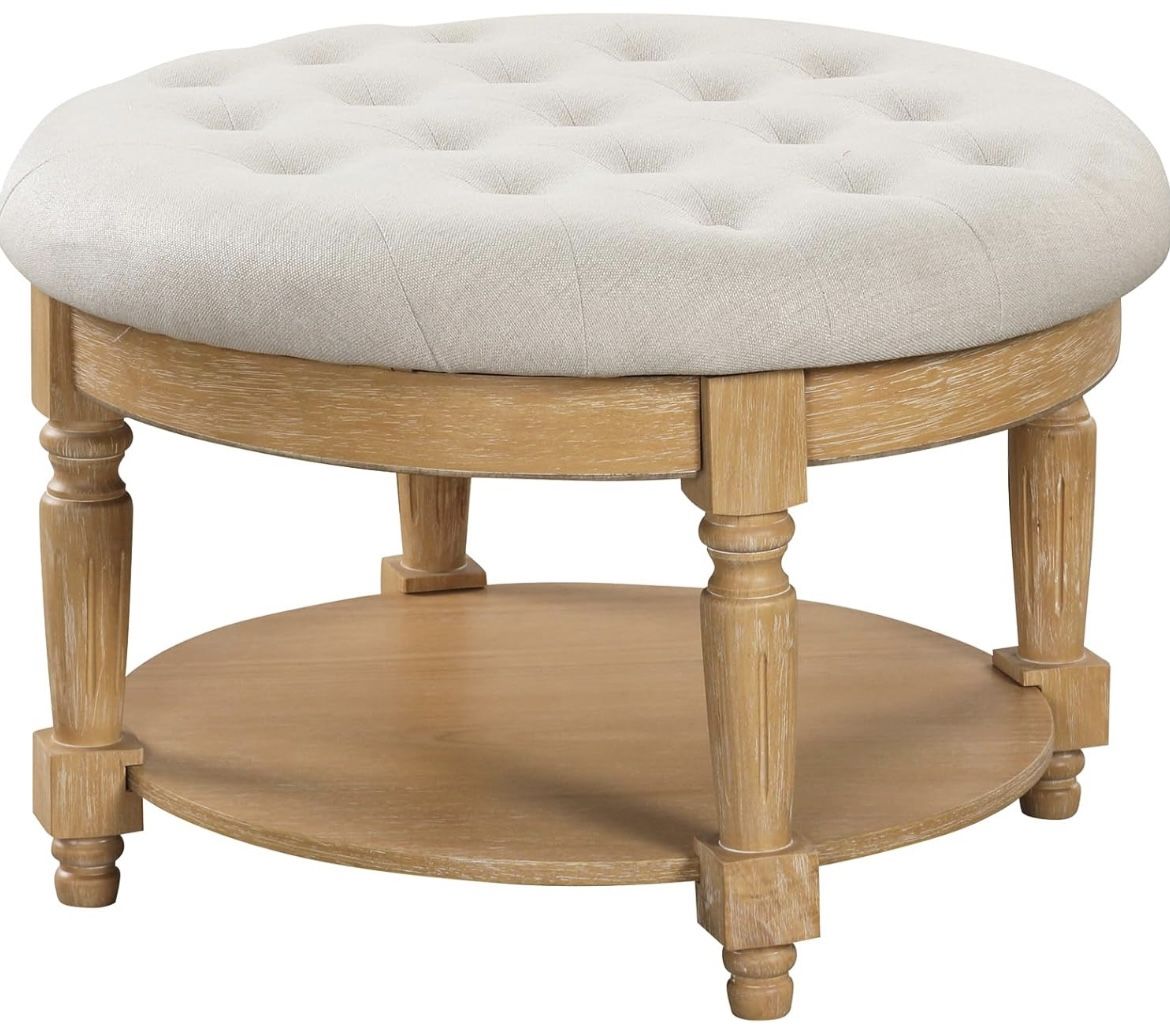 Giantex Large Ottoman Coffee Table - 29 inch Oversized Round Ottoman with Storage Shelf, Flip up Top, Wood Legs, Farmhouse Upholstered Tufted Ottoman Footrest for Living Room Bedroom, Beige & Natural Product Dimensions 29"D x 29"W x 19.5"H Color Beige & Natural Top Material Type Polyester Brand Giantex Fabric Type Polyester Base Material Rubber Wood 2-Tier Storage Space -- This oversized ottoman features a 2-tier design with a spacious top and bottom storage shelf, so you can store your clutter and keep your room organized. There is also a flip-top lid that reveals extra hidden storage space, perfect for keeping essentials accessible yet out of sight. Wide Range of Use -- Characterized by versatility, this ottoman with storage serves beautifully as a coffee table, footrest, or side table, providing multiple uses to cater to various needs in your living room, bedroom, balcony, or office. Sturdy Wooden Frame -- Built on a solid wooden frame that ensures stability and reliability, this round ottoman coffee table features sturdy rubber wood legs that are complemented by fine workmanship. Moreover, the non-slip foot pads are designed to make the ottoman wobble-free on any surface. Comfortable Cushion -- On the top of the footrest ottoman is a thick cushion, upholstered with a skin-friendly polyester fabric and filled with a high-density sponge. Undoubtedly, the large tufted ottoman provides strong support and ultimate comfort. Elegant Design -- Showcasing an elegant tufted surface of the cushion and retro wood legs, this ottoman coffee table blends seamlessly with all interior styles, offering a touch of vintage aesthetics to enhance the ambiance of any indoor setting. In