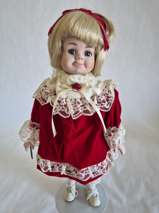 This 1990 Brinn's Authentic Collectible Edition Porcelain Doll was made in Taiwan. Her name is Cathy, she has the most adorable pouty face with a tear under her left eye. She is wearing a red velvet dress with lace, with bloomers, socks, and shoes. She comes with a stand, but she is able to sit as well. There is brownish areas on her shoes, possibly dried glue? See pictures. She may need some refreshing and/or fluffed up, as she has been packed up for some time. Contact me with any questions. Thank you