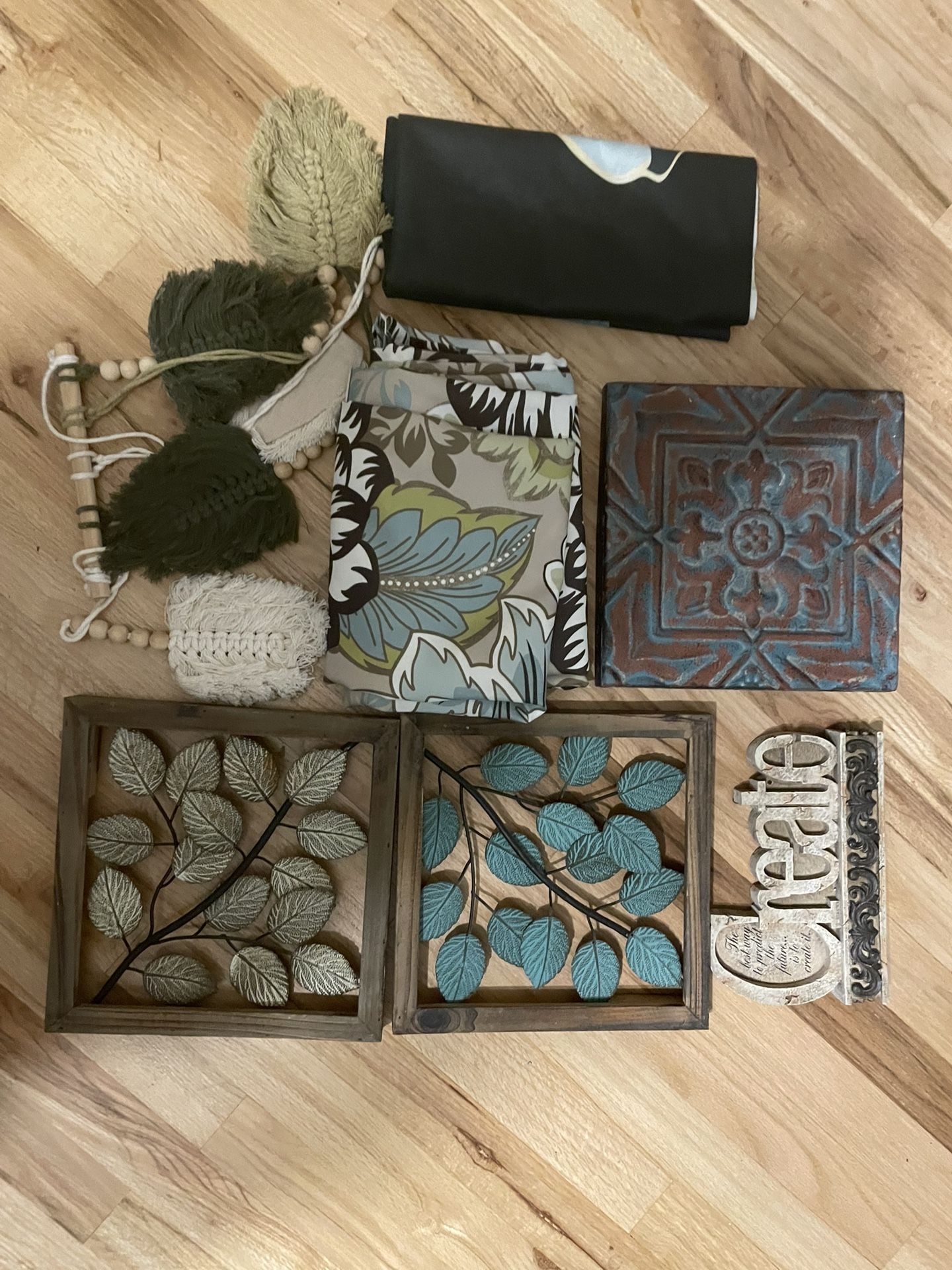 3 square wall decor, 1 boho bohemian macrame woven leaves, beautiful just washed shower curtain, “create” stone table/shelf decor, and a green blue mountain tapestry (this one is the only thing here that has a “flaw” I cut the sides but I liked it this way because it felt more chic / boho Meet at 14840 SE Webster Rd Milwaukie, OR 97267 United States