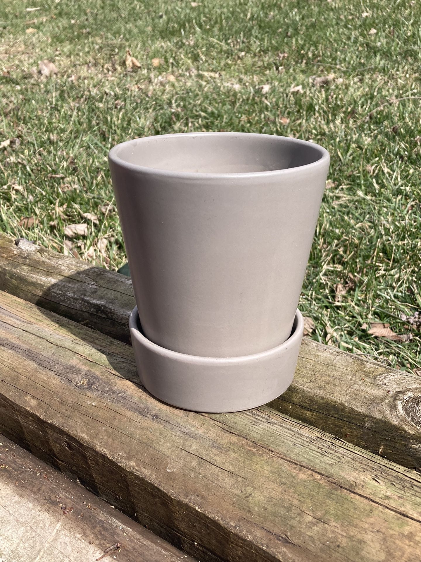 Matte taupe finish on this ceramic plant pot with attached saucer. 5” x 6” tall. No drain. Excellent condition. Asking $5. Pick up in Glendale Heights. Check out my other posts please for more garden planters and plant stands