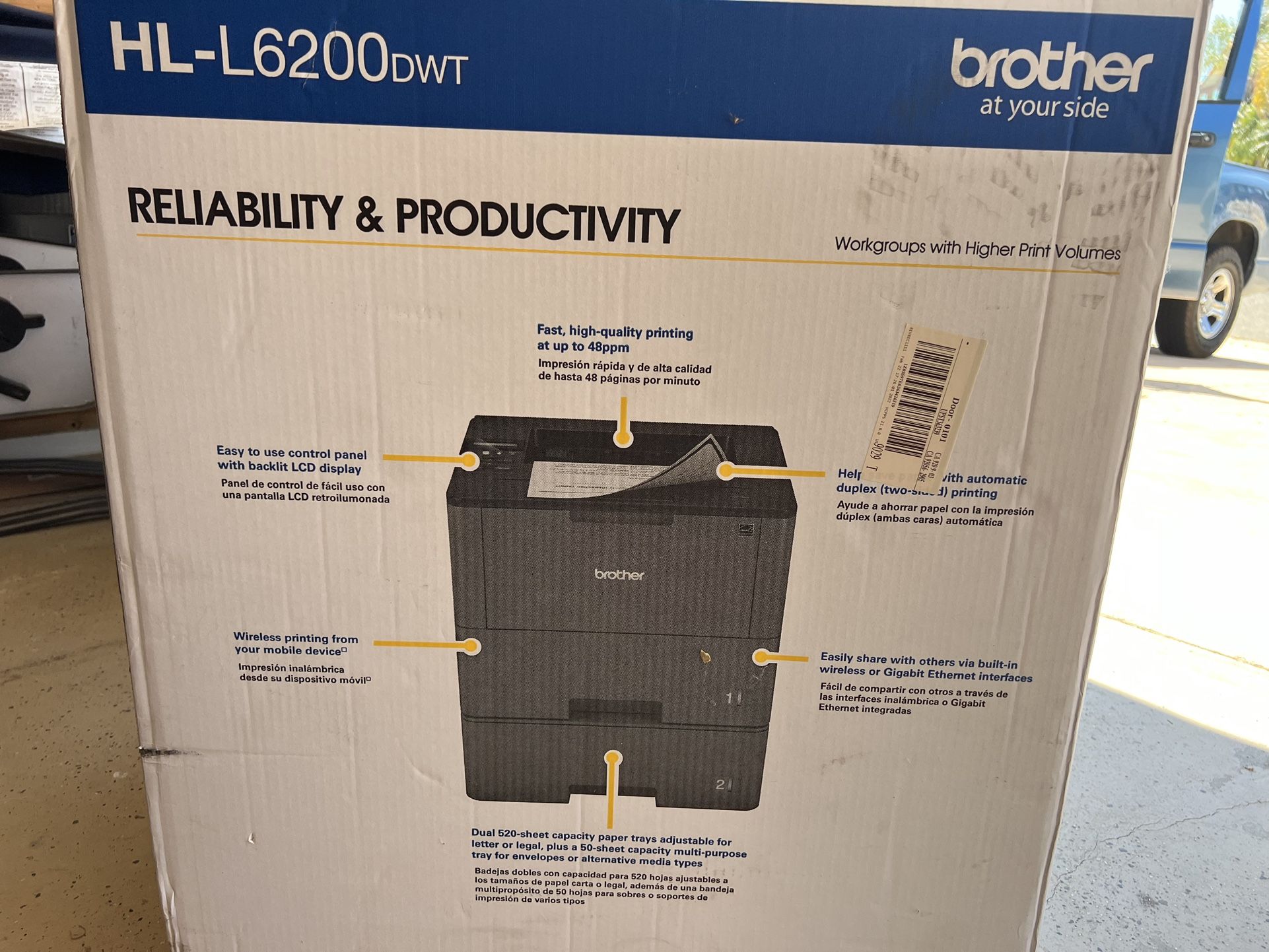 Brand new in box. Never opened. Brother Monochrome Laser Printer, HL-L6200DWT, Duplex Printing, Mobile Printing, Dual Paper Trays, Wireless Networking, Amazon Dash Replenishment Ready