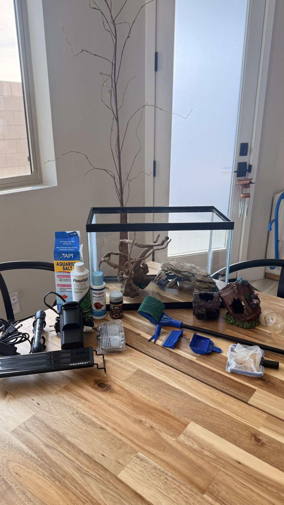5 Gallon tank and all items completely functional (Don’t have space for fish anymore) Decorations: Natural spider wood, 2 hides, 1 floating log, plant holder. 5-in-1 scrubber, planter, scraper, and scoopers Tech: 5 gallon filter with new filter pad, 5 gallon tank heater, LED tank lights (all functional) Nutrients: 36oz aquarium salt, half bottle of plant Flourish, new bottle of Aqueon Betta water conditioner, 3/4 bottle of Betta Pro shrimp patty pellets