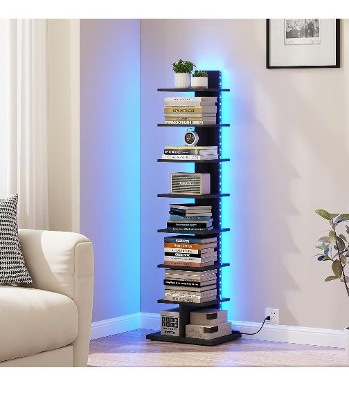 TUTOTAK Narrow Bookshelf, 8-Tier Bookcase with LED Lights, Spine Book Shelf for Small Space, Corner Standing Shelf for Living Room, Office, Study, Entryway, Black BS06BK008L Material Engineered Wood Mounting Type Assemble Room Type Living Room, home office Shelf Type Engineered Wood Number of Shelves 8 Special Feature Display shelf [Remote-Controlled LED Lights] This bookshelf comes with a built-in LED light strip. When lit up at night, its soft light spreads across the entire shelf, creating a warm indoor atmosphere. The light supports three adjustment modes, and with the included remote control, you can easily turn it on/off, adjust the brightness, and switch between modes without getting up—practical and convenient. [Three-sided Open Design] The unique three-sided open layout makes it more convenient for you to take books and find the books you need at a glance. This design not only improves space utilization, but also creates a visual feeling as if books are suspended in the air, adding interest and a sense of design to the room. [Save Space and Large Capacity] This spine book tower covers an area of less than 1 ft² and can be easily placed in any corner. The eight-layer bookshelf makes full use of vertical space and provides more storage areas for your books, decorations and other items. [Stable and Safe] The bottom and back of the bookshelf adopt a double-reinforced structure, which greatly enhances the stability of the bookshelf. Each layer can bear up to 10 pounds. The included anti-tip kit can help you firmly fix the bookshelf on the wall to obtain higher stability and safety. [Easy Assembly] Simple and Easy to Assemble! Detailed graphic user’s manual instructions and spare parts are included in the package, no other special tools are required. It will take you about 15 minutes to finish the setup easily!Please remember to install the anti-tilting tool on the wall for better stability and less unexpected injuries.