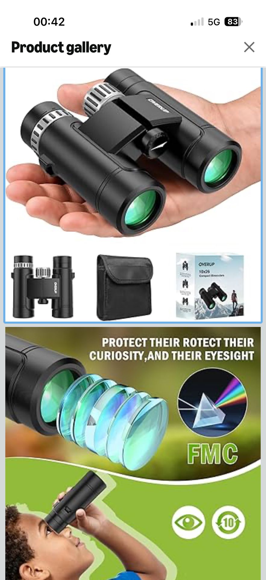 Top highlights Brand OVERUP Age Range (Description) Kids and Adults Special Feature Compact Design, Lightweight Objective Lens Diameter 26 Millimeters Magnification Maximum 10 x Specific Uses For Product Bird Watching, Concert, Hiking & Outdoors, Sport Watching, Travel 【10x26 High Powered Compact Binoculars for Adults & Kids】10x26 compact binoculars deliver 10x magnification, bringing distant targets 10x closer with crisp, bright visuals. Perfect for adults and kids (8+ years), these small binoculars for adults and kid binoculars are ideal for birdwatching, travel, concerts, opera, camping, hiking, sports events. They are essential gear for traveling, hunting, camping, and cruise trips. 【BAK4 Prism for Superior Clarity–Perfect for Kids & Adults】Featuring BAK4 prisms and fully multi-coated lenses, these binoculars for adults and kids provide sharp, vivid images even in low light. Whether you're birdwatching or at a sports game, enjoy crystal-clear vision with these compact binoculars—great for children’s outdoor adventures and adult travel.The twist-up eyecups make them comfortable for both adults and children who wear glasses, allowing for easy adjustment of eye relief for fatigue-free observation for extended periods. 【Ultra-Lightweight & Durable–Only 0.6lb(300g)!】Weighing just 0.5lbs, these small binoculars for adults and kids binoculars are foldable and shockproof, with soft armor for a secure grip. Perfect for children (8+ years) and adults who need portable optics—take them hiking, traveling, or to events without strain! 【Waterproof IPX7 & Anti-Fog–Built for Outdoor Adventures】Designed for hunters, birdwatchers, and travelers, these binoculars for adults and kids feature daily waterproofing and anti-fog coating. The rubber-armored body ensures durability, making them perfect for harsh weather—whether you're on a cruise, safari, forest hiking, outdoor camping, or backyard exploration! 【Perfect Gift for Kids & Adults–Easy to Use!】With quick 3-step focusing, these compact binoculars are ideal for children and adults. Great for birdwatching, concerts, sports, and more—plus, they make the best gift for holidays (Christmas, Father’s Day). Whether for your son, daughter, or yourself, enjoy crisp, close-up views anytime!