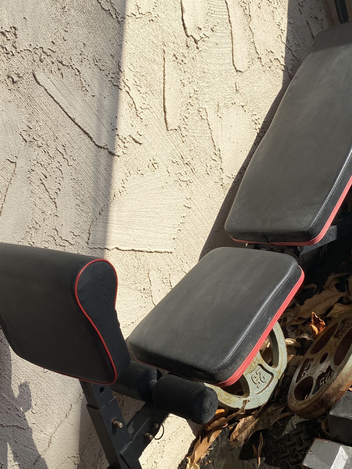Weight bench in excellent condition no tears my son had it for the past six months. It’s been sitting on my patio not used and there is a ton of weights. I will sell the weight bench for $100 including all the weights which is an amazing deal those weights are expensive. If you look in the pictures, you can see all the weights.