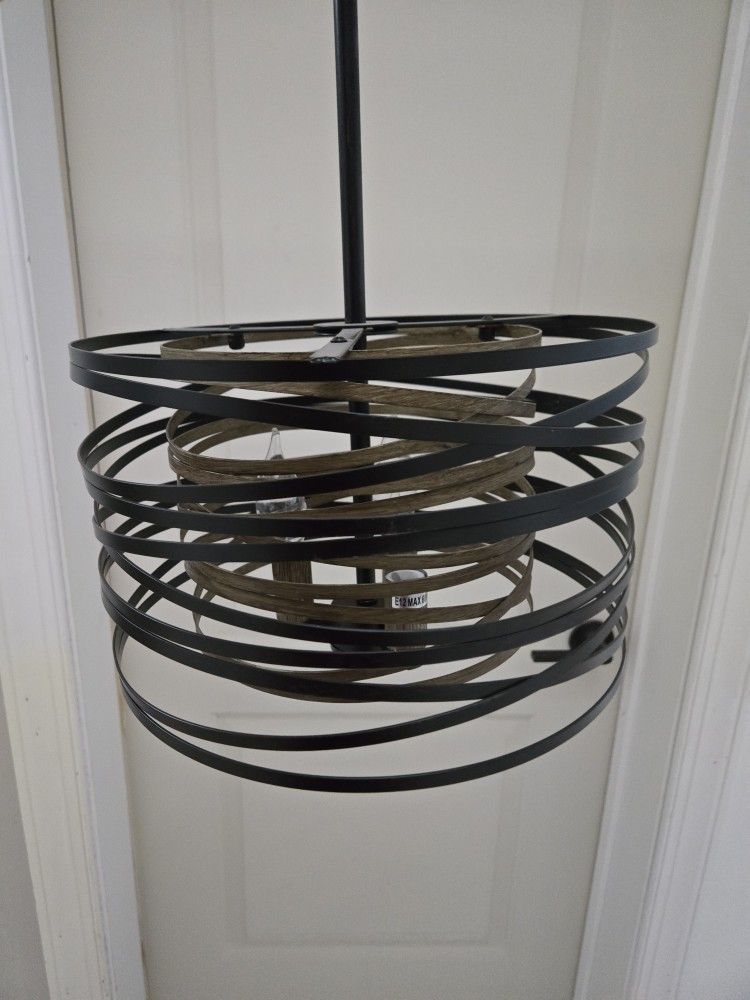 Indoor hanging light with a spiral design, hangs down 2 ft and has a diameter of 12.5 inches. Needs 3 light bulbs already has 2 on it. Nice piece but don't have anywhere to put it right now, still new out the box. Please let me know if you're interested.