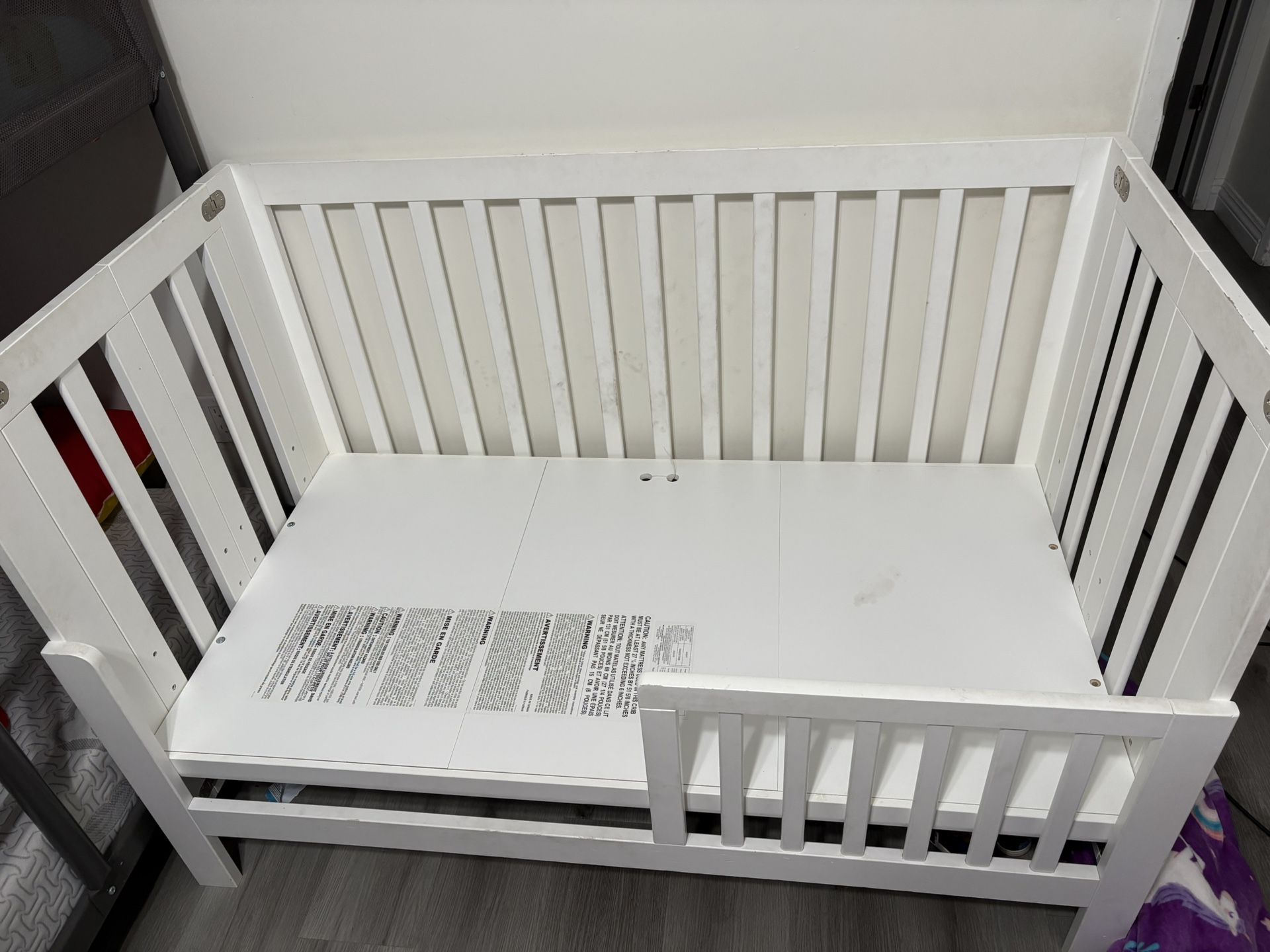 Toddler bed folds & comes with a bottom frame. Still fits a crib size mattress. (Mattress not included)