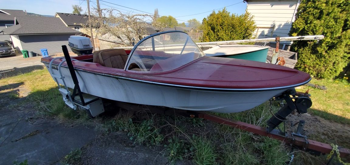 Vintage Bellboy Ballerina fiberflass runabout. Red gel coat was done a couple years ago but is flaking. Has windshield (hard to find, needs to be attached) Johnson electromatic 40hp ran when it came off the last boat, but hasn't been run yet. Project, but all the parts are there and very cool once it's finished, I just don't have the time to take it on.