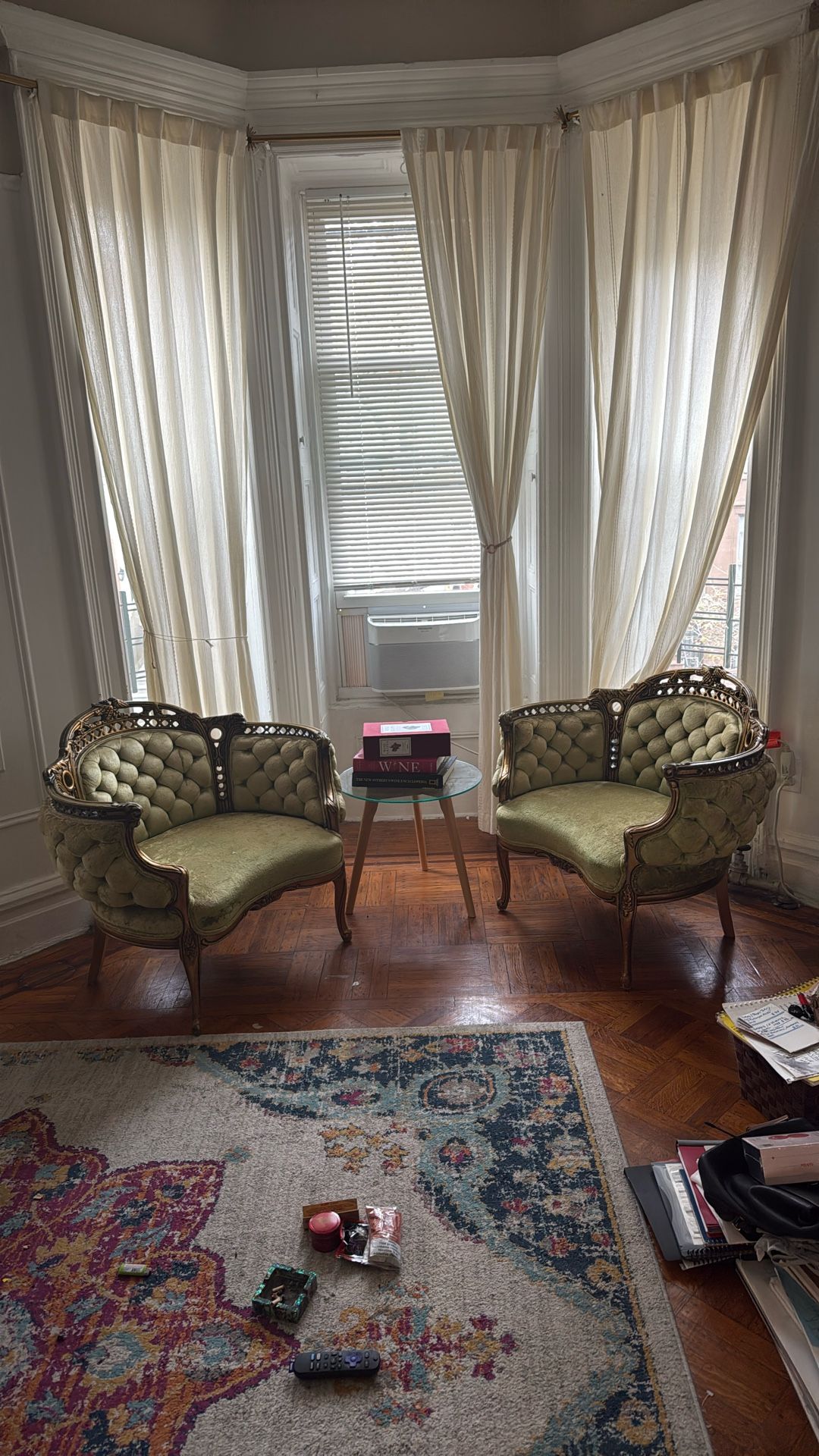 Beautiful vintage Victorian-style settee with intricate carved wood detailing and plush tufted upholstery. The frame features stunning Baroque/Rococo-style scrollwork, cabriole legs, and elegant curves. The upholstery is a soft sage/olive green with a classic deep-tufted backrest. There is some natural wear consistent with age (mainly on the seat cushion), but the structure is solid and the piece is overall in great vintage condition. $300 per chair or $500 for both. Open to reasonable offers. Pick up in Bedstuy, Cash or Venmo please.