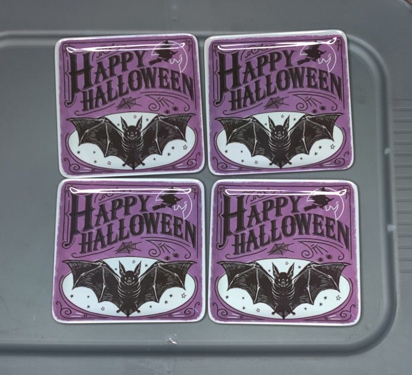 Retro Style Halloween Dessert Plate Set of 4 Purple and Black in color Witches and Bats Happy Halloween Square Shape Made of Melamine NWOT. Excellent Condition Measures Approx: 6"x6" Weight 1-1/2 lbs wrapped Check out my other listings!