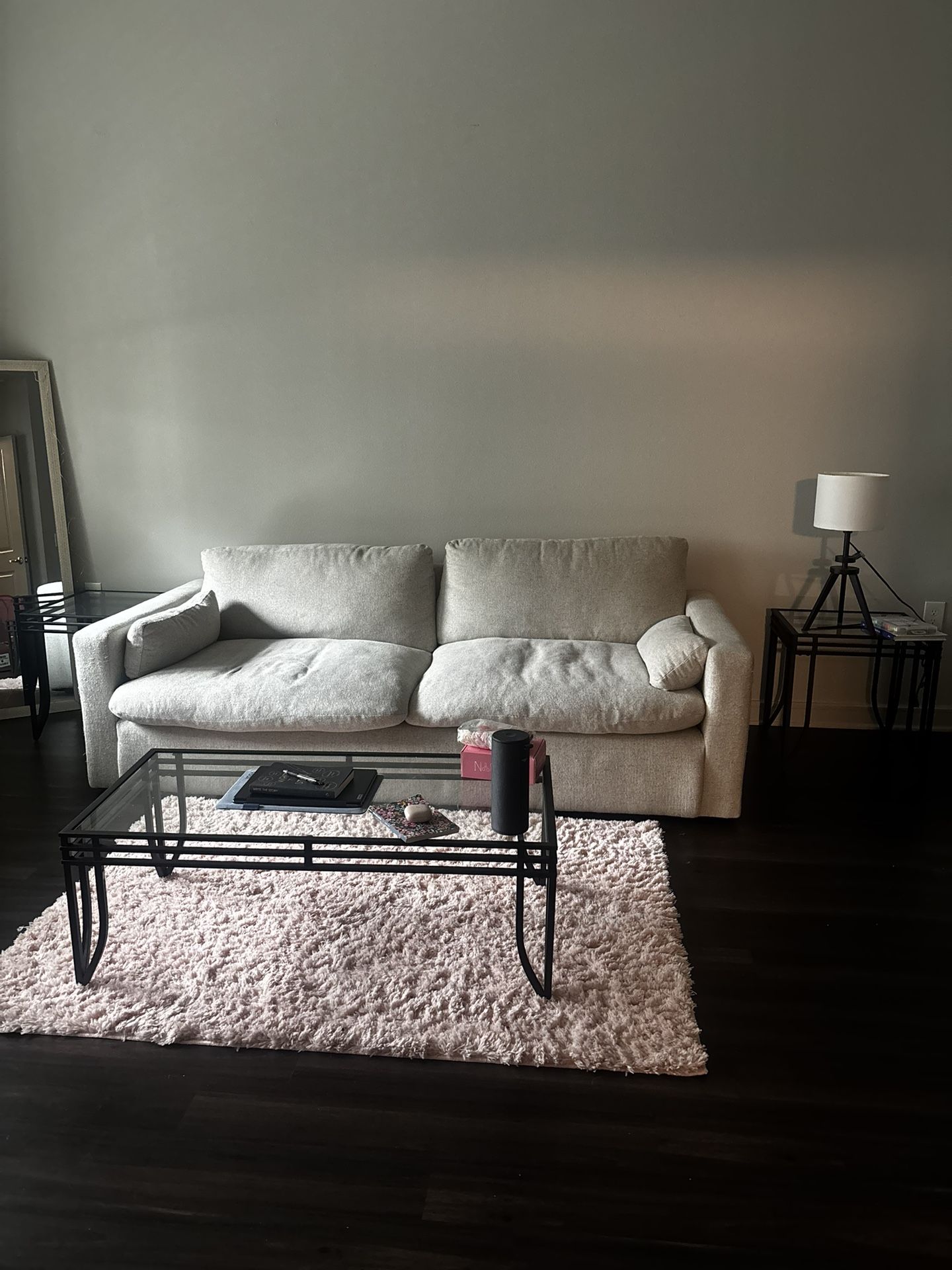 Brand new, extremely comfortable modern sofa. I’m only selling because I’m moving, and I’m honestly sad to let it go, it’s the comfiest couch I’ve owned. Neutral cream color, deep seats, and soft cushions. No stains, tears, or pets. Looks great with any style of decor.