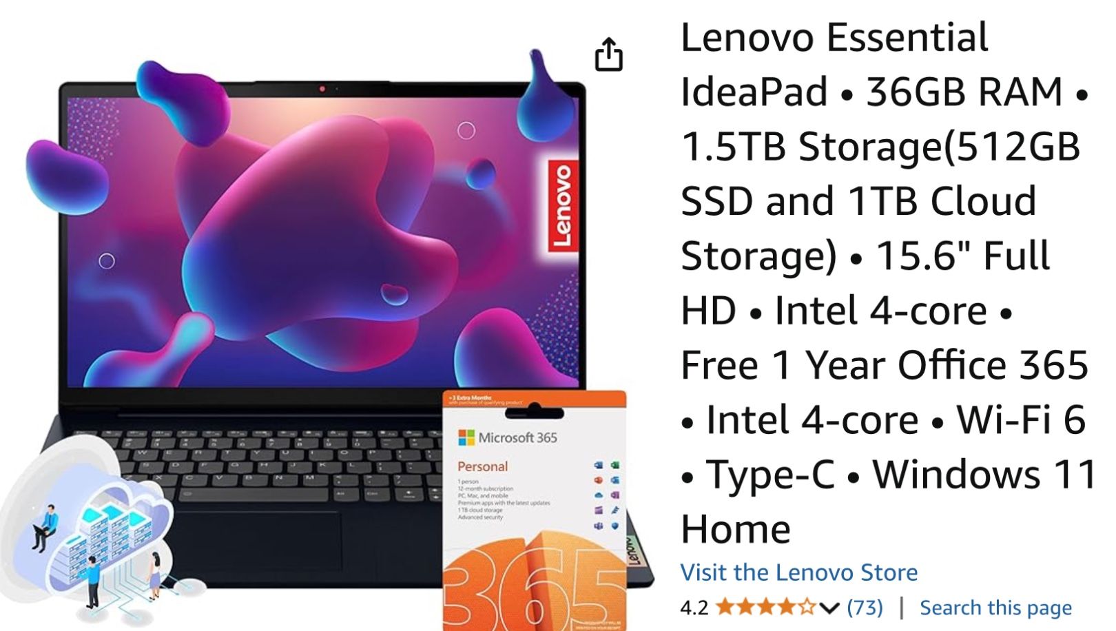 NEW, UNOPENED STILL IN BOX. Lenovo Essential IdeaPad • 36GB RAM • 1.5TB Storage(512GB SSD and 1TB Cloud Storage) • 15.6" Full HD • Intel 4-core • Free 1 Year Office 365 • Intel 4-core • Wi-Fi 6 • Type-C • Windows 11 Home.