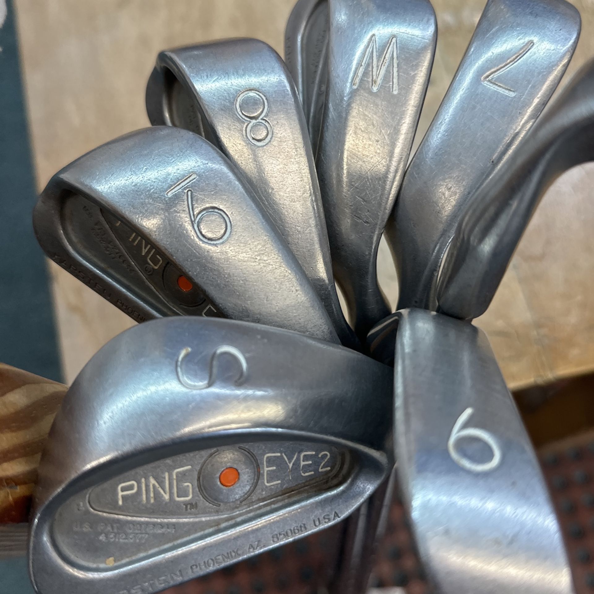 Ping eye2 red dot iron set nine through six, iron pitching, wedge, and sand wedge. Steel stiff shafts.