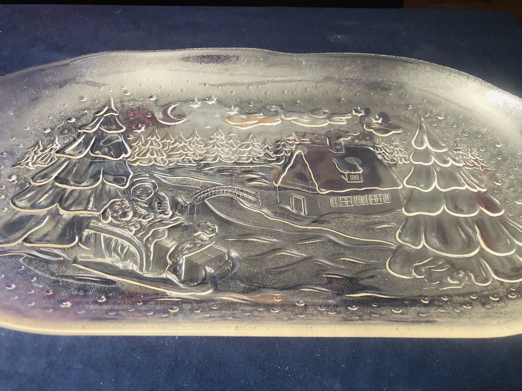In great used conditions, oblong glass serving place. Embossed Christmas motive: Tall Christmas trees surrounding a cozy wood cabin, bridge, person with dog in a sled with gifts. No visible, cracks, chips damage. Measurements: 14 5/8" x 8" x 1" Clean, smoke free home No deliveries First come/ First serve Location: Furneaux Ln & Frankford Rd. Carrollton 75007 Cash, Cash App, Venmo, PayPal Thanks for looking at today's item!💕 Hablo español!😊