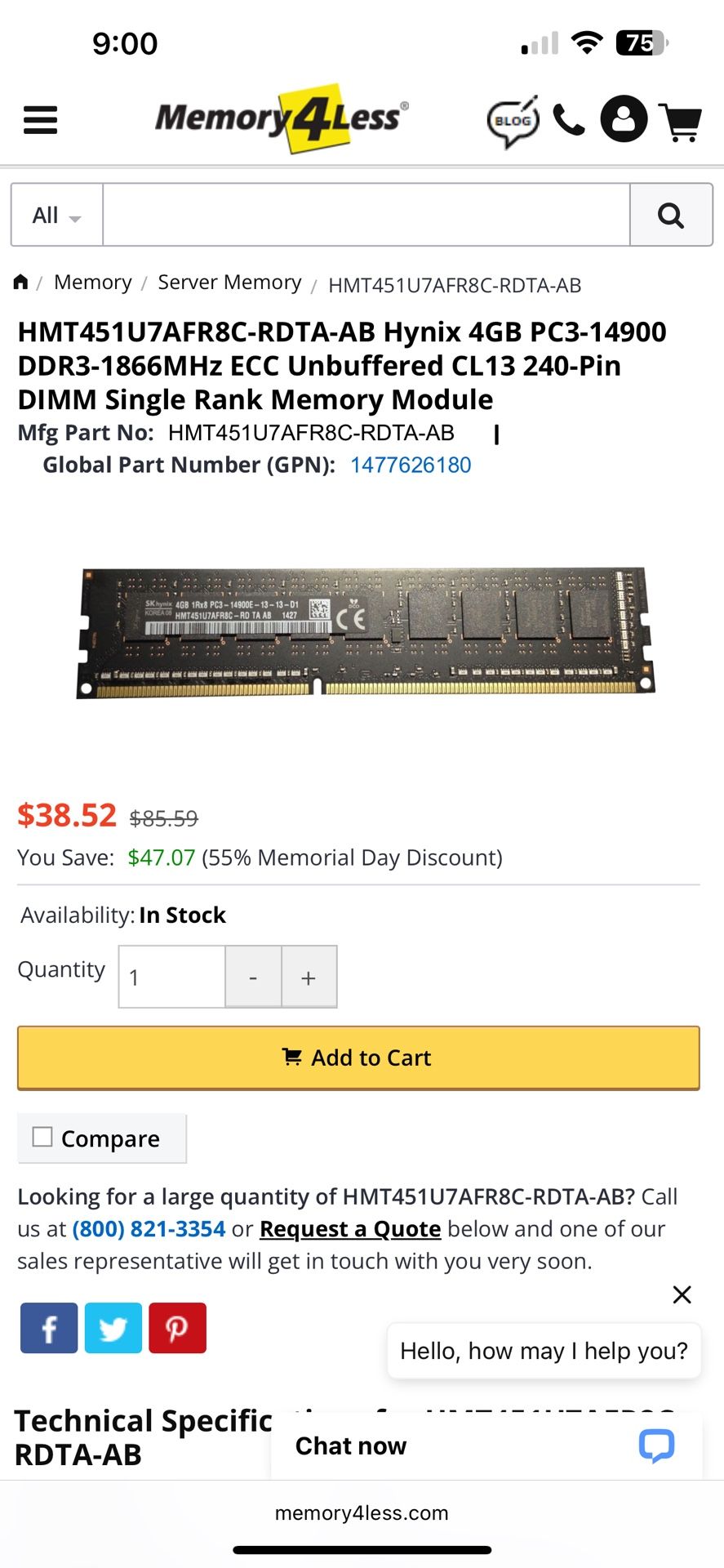 Yes available. Firm. Cash/pick up only. Manufacturer Hynix Manufacturer Part # HMT451U7AFR8C-RDTA-AB Memory Type DDR3 SDRAM Capacity 4GB Data Transfer Rate 1866Mhz Pins 240 Pin Bus Type PC-14900 Error Correction ECC Cycle Time 1.07ns Cas CL13 Memory Clock 233Mhz Rank Rank 1 Voltage 1.5