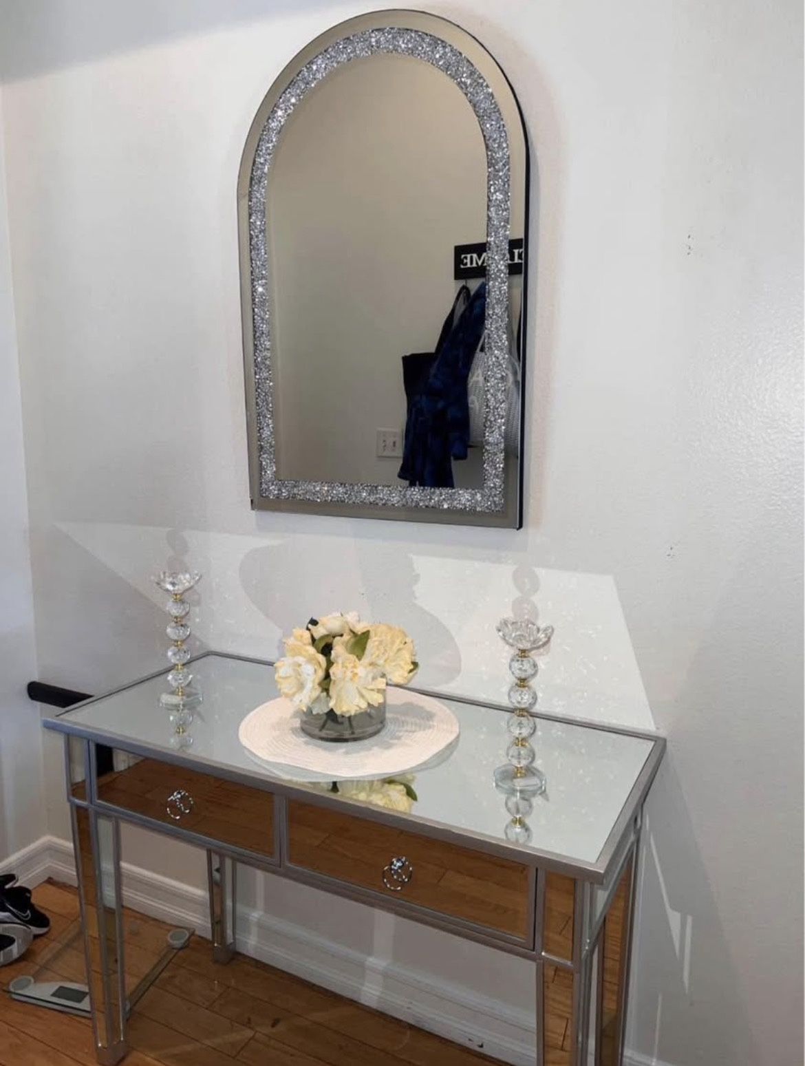 Mirror desk and beautiful mirror there is one little chip in the mirror, but you can barely see on the bottom corner and on the bottom leg in the back of the drawer there is also a chip, but you cannot see it can be used for a vanity or entryway need gone as soon as possible. I’m moving excepting any offers.