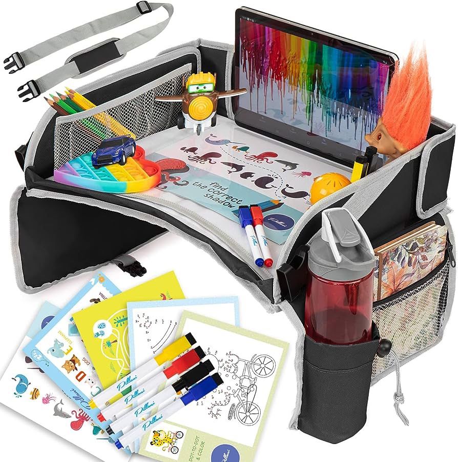 【Travel and Roadtrip Essentials】- Keep your toddler entertained for hours, even on long drives! Our kids travel tray & road trip must have is designed to hold up their iPad or tablets, so they can easily watch their favourite shows while giving them the freedom to play, make drawings, and enjoy their food comfortably. This travel toy has a mess-free design and comes with 5 original printed games kit and 4 colourful markers to let them explore their creativity through art. 【Portable Carseat Tray and Road Trip Must Haves】- Our car seat tray for kids has a compact size of 16.5 x 13 x 4.5 inches with easily accessible organization pockets. It sits securely on a child's lap and allows kids to enjoy road trips while drawing with their art supplies, having snacks, or playing with their favorite toys. This car seat tray will give parents the advantage of enjoying a quiet ride while their kids stay entertained when traveling or during airplane flights! 【Premium Quality for Long-Lasting Use】- Made of high-quality materials to give your kids a travel companion that will last a long time. Its 600D Oxford material ensures a lightweight & tough quality that can keep up w/ every road trip activities for kids. It features a padded shoulder strap for a comfortable carry & a collapsible design for superior portability & convenience of storage when not in use. The Velcro straps combine w/ a heavy-duty buckle guarantee the safety of the kids travel tray 【Mess-Free & Multipurpose Entertainment Gear】- Designed with a 15.5in wide x 12in deep erasable drawing platform that doubles as a food tray, so kids won't have to switch places when they get hungry. This car seat tray has a water bottle holder to keep your child's beverage in easy-reach access. It has a 1.5in wide adjustable carrying strap with a shoulder pad for a comfortable and strain-free carry. Its extra high side walls are made ideal for kids, measuring 12in in length and 4in in height. 【An Excellent Gift Idea】- Never show up empty-handed to your kid's celebration and get them these travel toys & road trip essential designed to support their active imaginations! Show your love and care to your kids, nieces, or nephews and get them an ideal present with our car seat table tray for preschoolers. Click 'Add to Cart' now and surprise your kid with a table that fits any car seat or booster or have it wrapped up for birthdays, Christmas, Thanksgiving, and other festive celebrations.