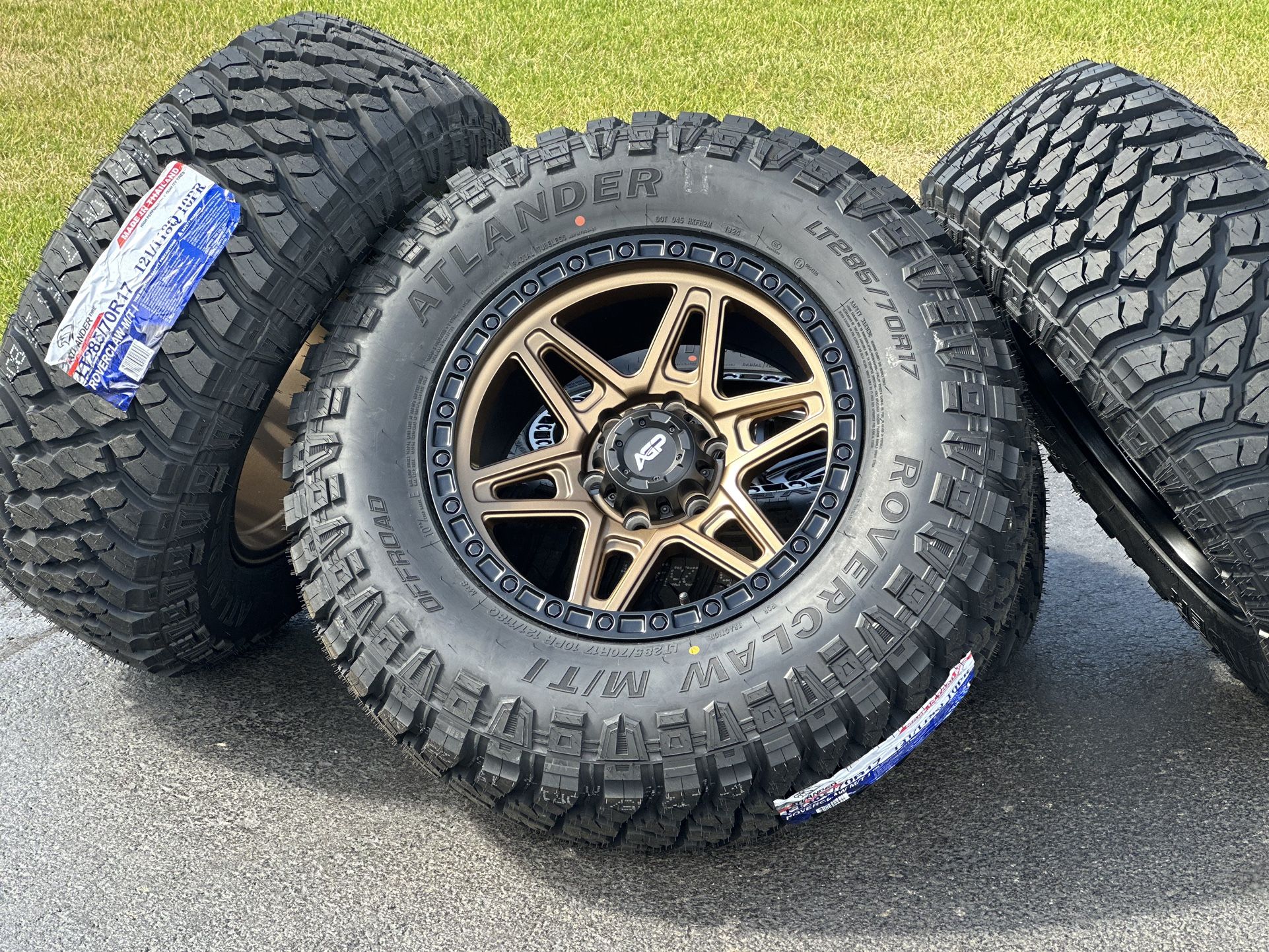 NEW 2024 Set of 4 Wheels and Tires, 17” AGP 307 Wheels (black or bronze available) 6 lug 6x139.7mm wrapped in New Atlander Roverclaw Mud Terrain Tires LT285/70R17 M/T great for mud and snow conditions. Rims are 17x9.0 with a neutral offset (17x9.0J ET+0 mm) for a more aggressive look when compared to original wheels Tires are 33” in overall diameter, Atlander Roverclaw size LT 285/70R17 All Terrain, Load Range E, 10-ply, New with 0 miles on them Bolt pattern is 6x139.7 mm (also known as 6x5.5 inches) Price is firm $1450 before tax. Cash, Zelle, Card (+2.6%) and financing is accepted Installation, test fitment, lug nuts, TPMS, and financing is available. Will fit 1(contact info removed) all Silverado Z71 LT Custom Trail Boss High Country WT LTZ Tahoe Suburban GMC Sierra Pro SLE Elevation SLT RST AT4 AT4X Yukon Denali etc as well as Cadillac Escalade Luxury, Premium Luxury, Sport, Premium Luxury Platinum, and Sport Platinum models. Will ALSO fit most LIFTED 6 lug Toyota and Lexus vehicles: 1(contact info removed) Toyota 4runner 1(contact info removed) Toyota Tacoma 2007 - 2014 Toyota FJ Cruiser 2001 - 2007 Toyota Sequoia 2000 - 2006 Toyota Tundra Lexus GX470 GX460 and more (6lug only) Older tundra and older sequoia (2008 and below)