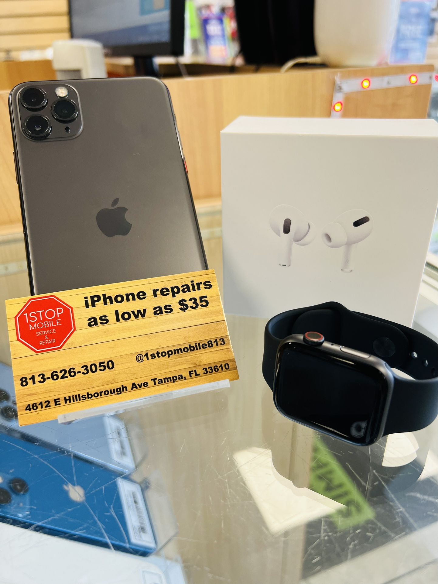 iPhone 11 Pro Max in great condition , works for ANY carrier and comes with all accessories. All colors and GB are available 📍WE ALSO TAKE TRADE INS 📍 We also carry Samsungs , iPads , Apple Watch’s and much more ! Come see it today at One Stop Mobile ⬇️ 📍4612 E. Hillsbrough Ave. Tampa, FL 33610