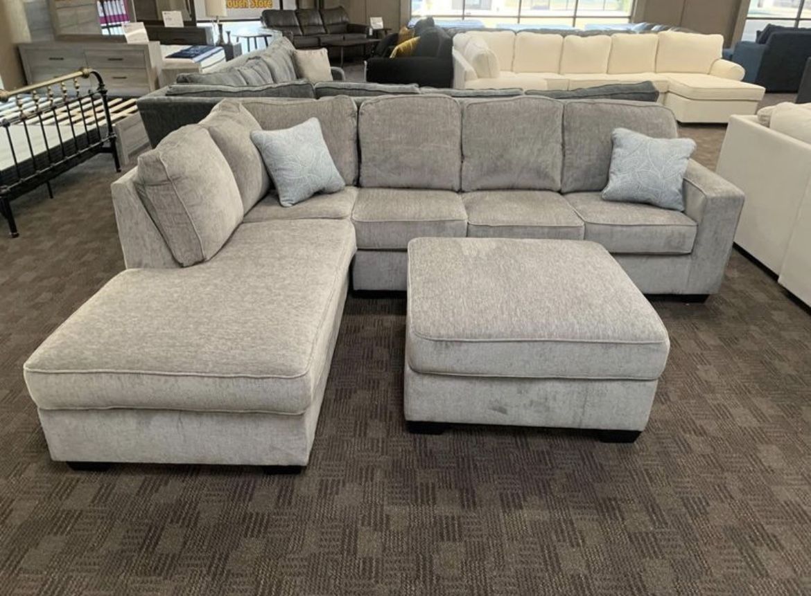 Brand new sectional. Grey soft fabric. Attached back pillows. Measures 111” by 90” Delivery and financing available