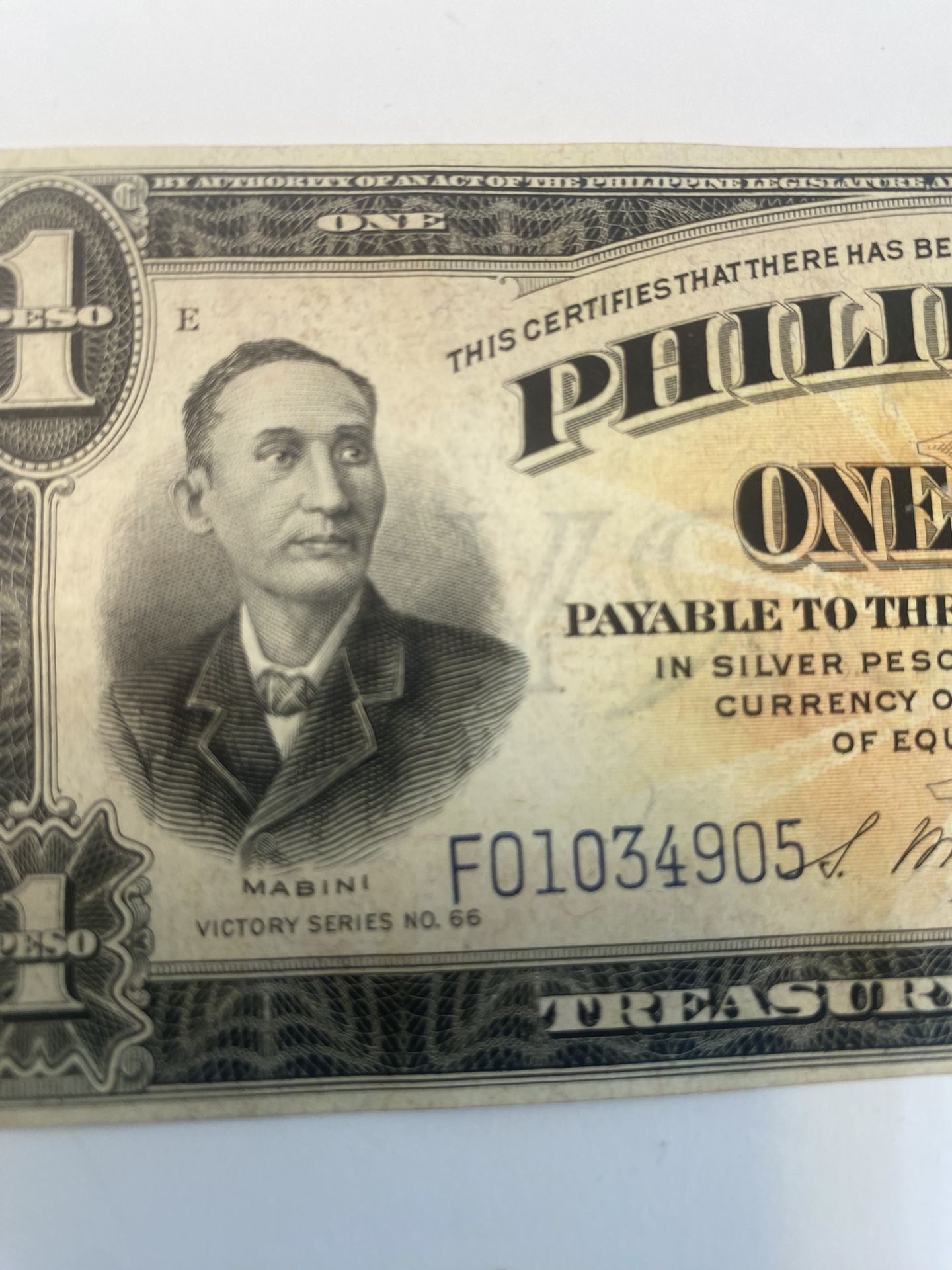 I have for sale a 1944 Philippines, one peso bill. This is a blue seal note printed by the United States for the Commonwealth of the Philippines. This note is commonly referred to as a victory note as it was printed after World War II this note is extremely clean and is in uncirculated condition.