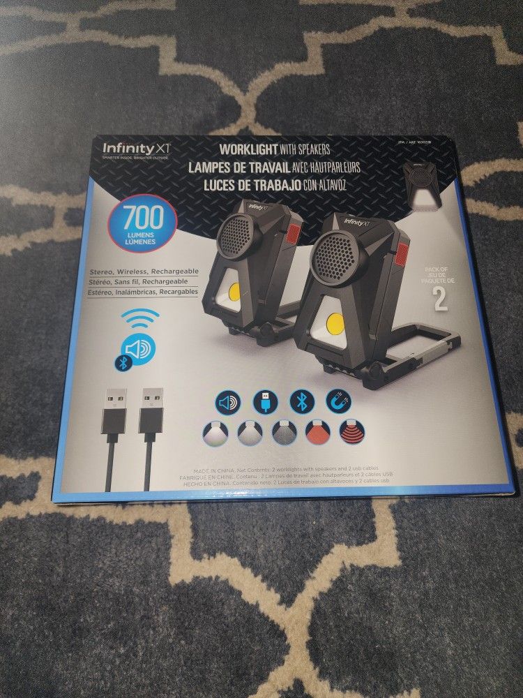 INFINITY X1 WORK LIGHT WITH SPEAKERS RECHARGEABLE ( YOU CAN CHARGE LIKE PHONE). COMES WITH 2 PCS OF LIGHTS WITH IN BUILT-IN SPEAKERS. BRAND NEW IN BOX
