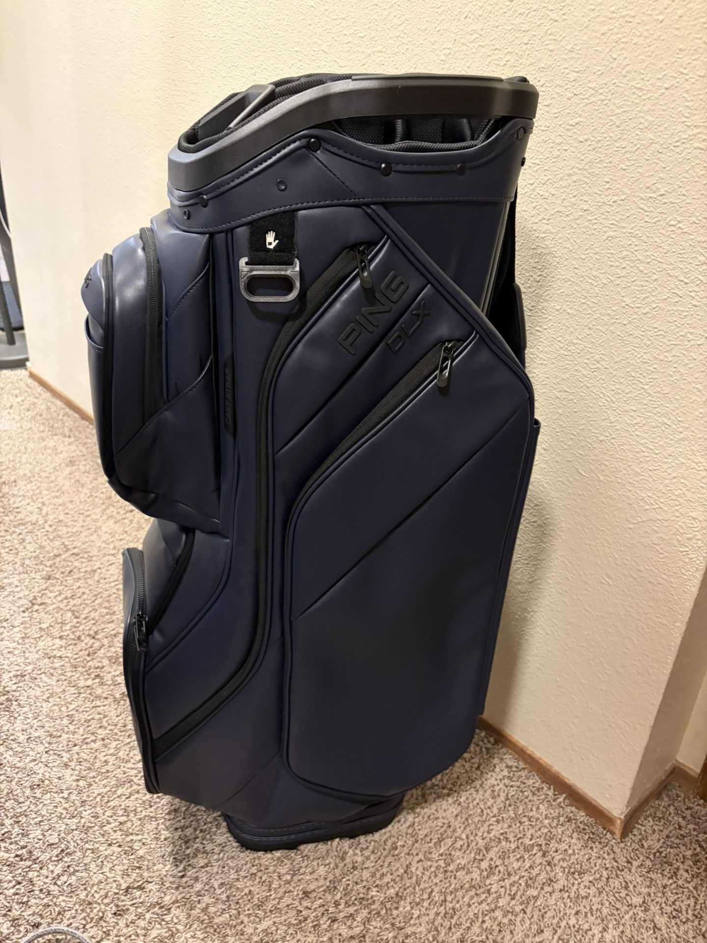 Ping DLX cart bag in leather (Leatherette) finish in Navy. Only used to for range twice and used to store extra clubs at home. Like new condition. Open for reasonable offers