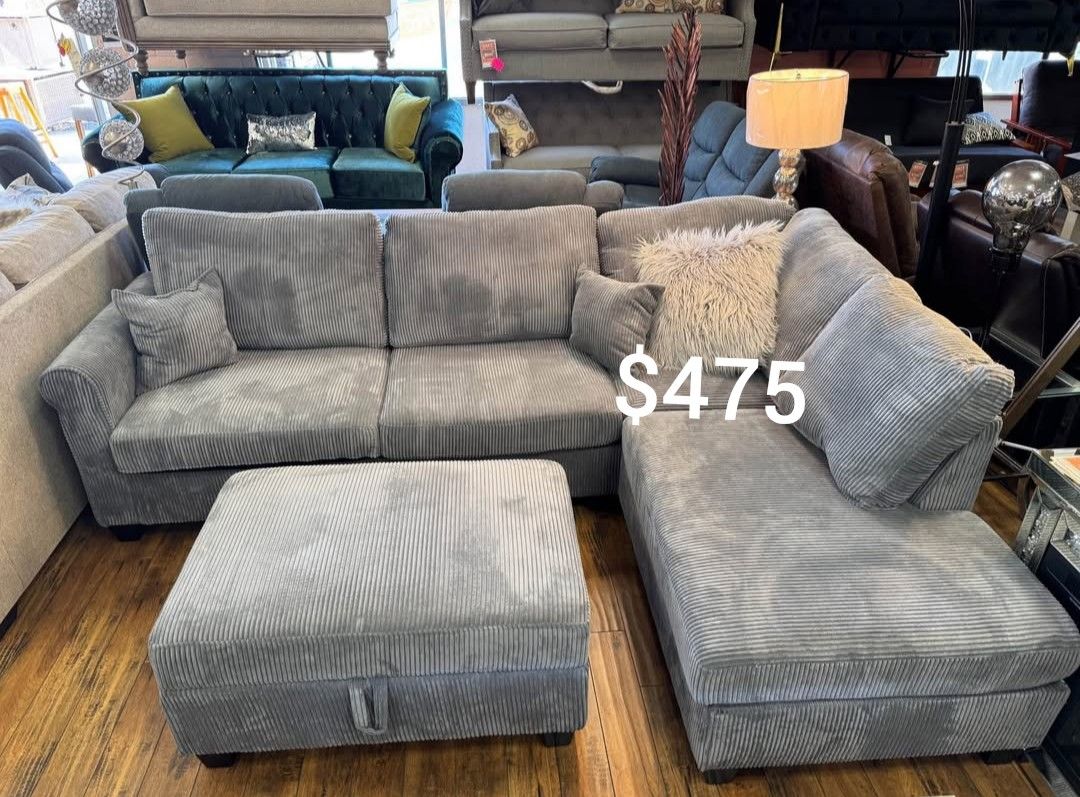 Grey Corduroy Sectional Sofa With Storage Ottoman New ✅ $475 No Tax