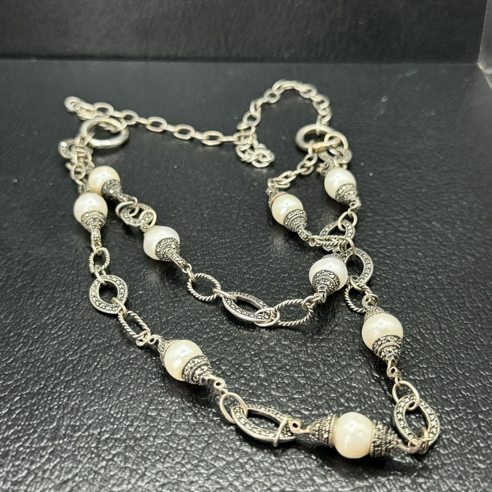 vintage statement sterling silver 925 real pearl and marcasite necklace Double strand necklace Missing small marcasite stone (no visible) Is vintage necklace Real sterling silver 925 Tested pearl 10mm wide 63 grams the first strand measures 22” inch long