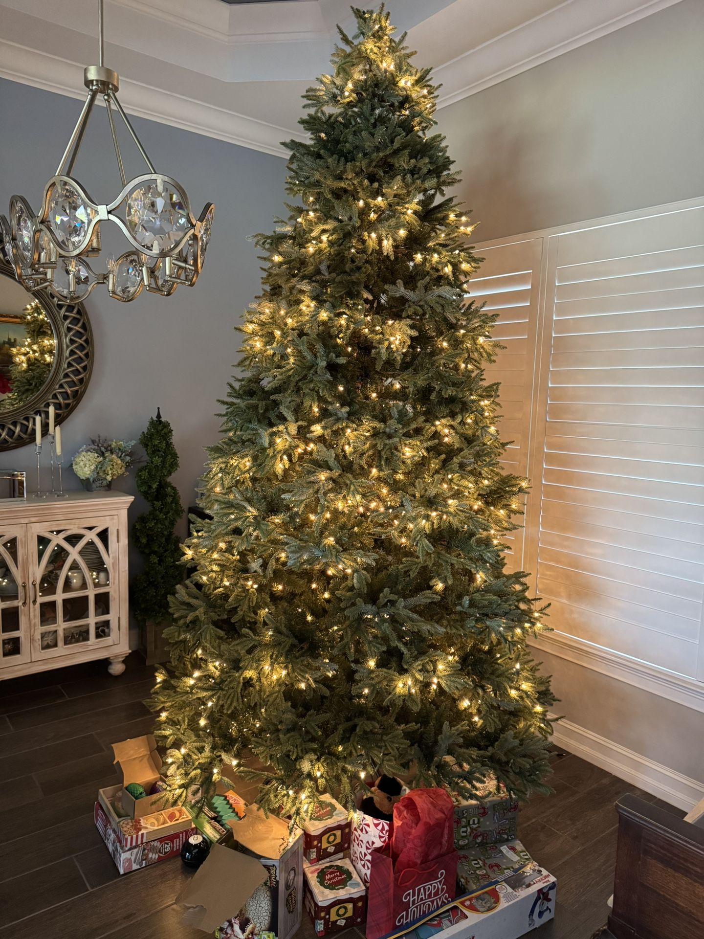 Balsam Hill Frasier Fir Christmas Tree 9 feet tall. Needs 3 areas to be restrung but most of it lights up. Great tree. It has incandescent soft white lights. Comes with the storage bags.
