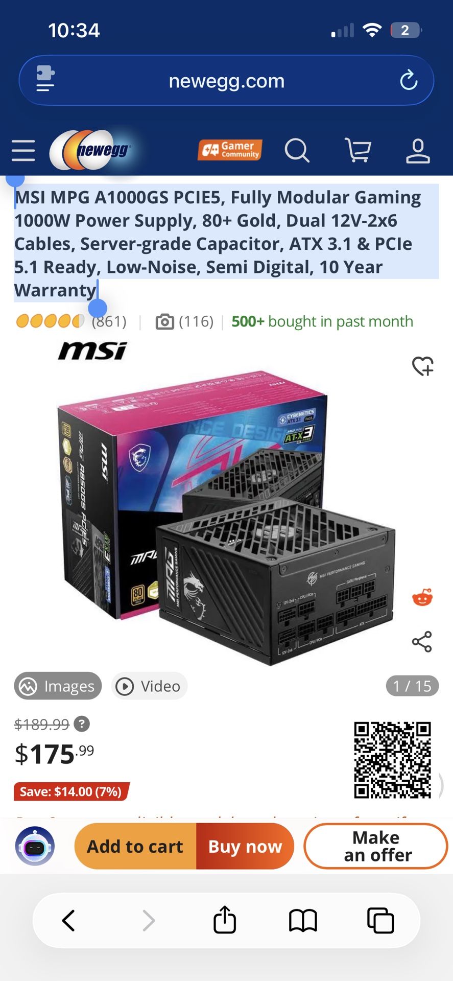 MSI MPG A1000GS PCIE5, Fully Modular Gaming 1000W Power Supply, 80+ Gold, Dual 12V-2x6 Cables, Server-grade Capacitor, ATX 3.1 & PCIe 5.1 Ready, Low-Noise, Semi Digital Brand new with cables Bought the wrong one #PSU#Computer