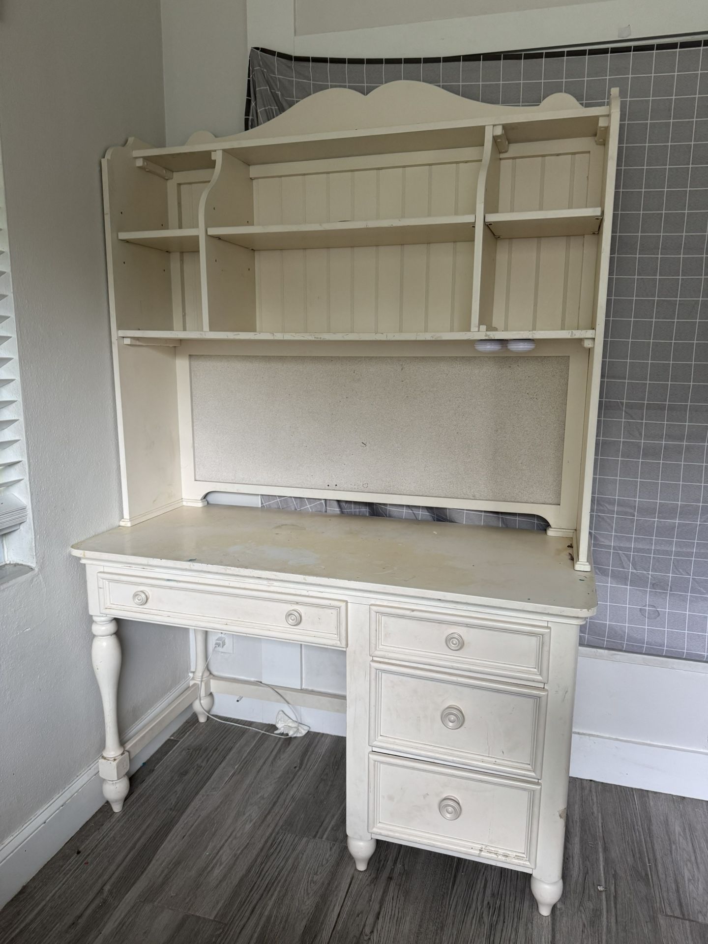Wood dresser/desk set. New coat of paint recommended. Drawers work. Dresser- 18x58x33 Desk/hutch- 22x50x72