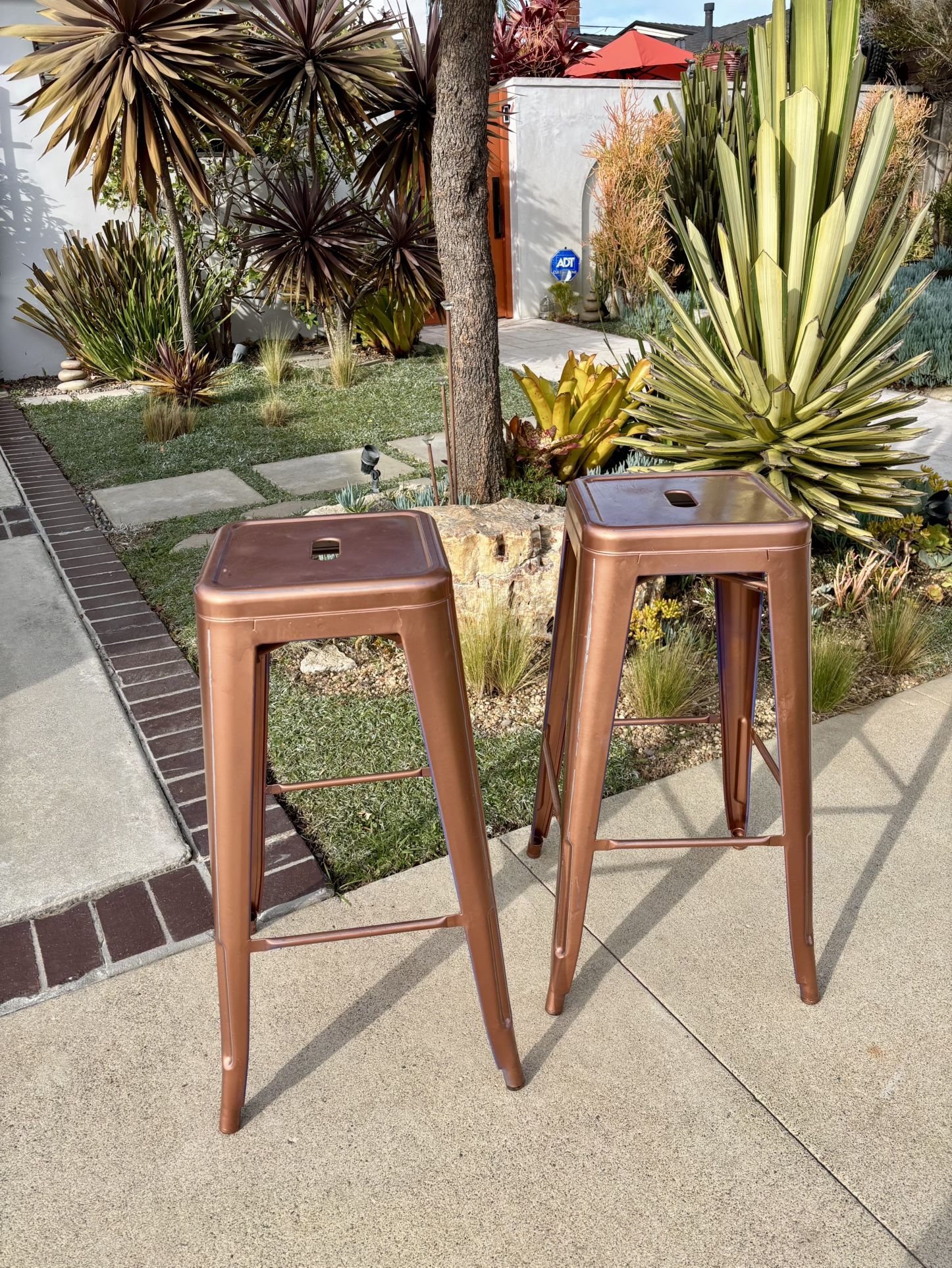 Two barstools originally color was blue. We painted them copper they could be easily repainted. The copper has a cool vintage vibe Located in Seal Beach they only come as a pair