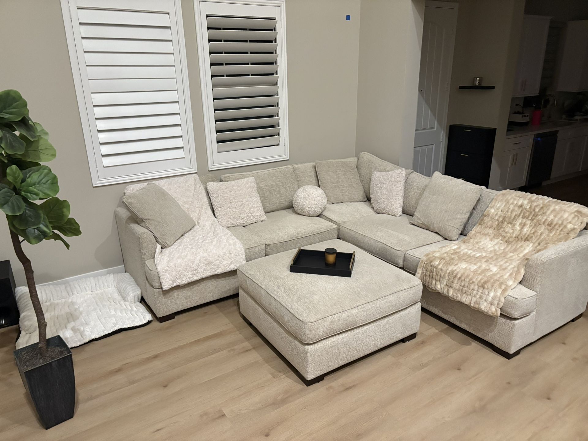 Sectional sofa with ottoman. 9 ft by 9ft. Couch is in great condition with no rips, stains or tears. It was in our family room which we hardly used. Bought from Macys for over 3k. Moved so we don’t have room for it anymore. Comes with the three large pillows that match the couch.