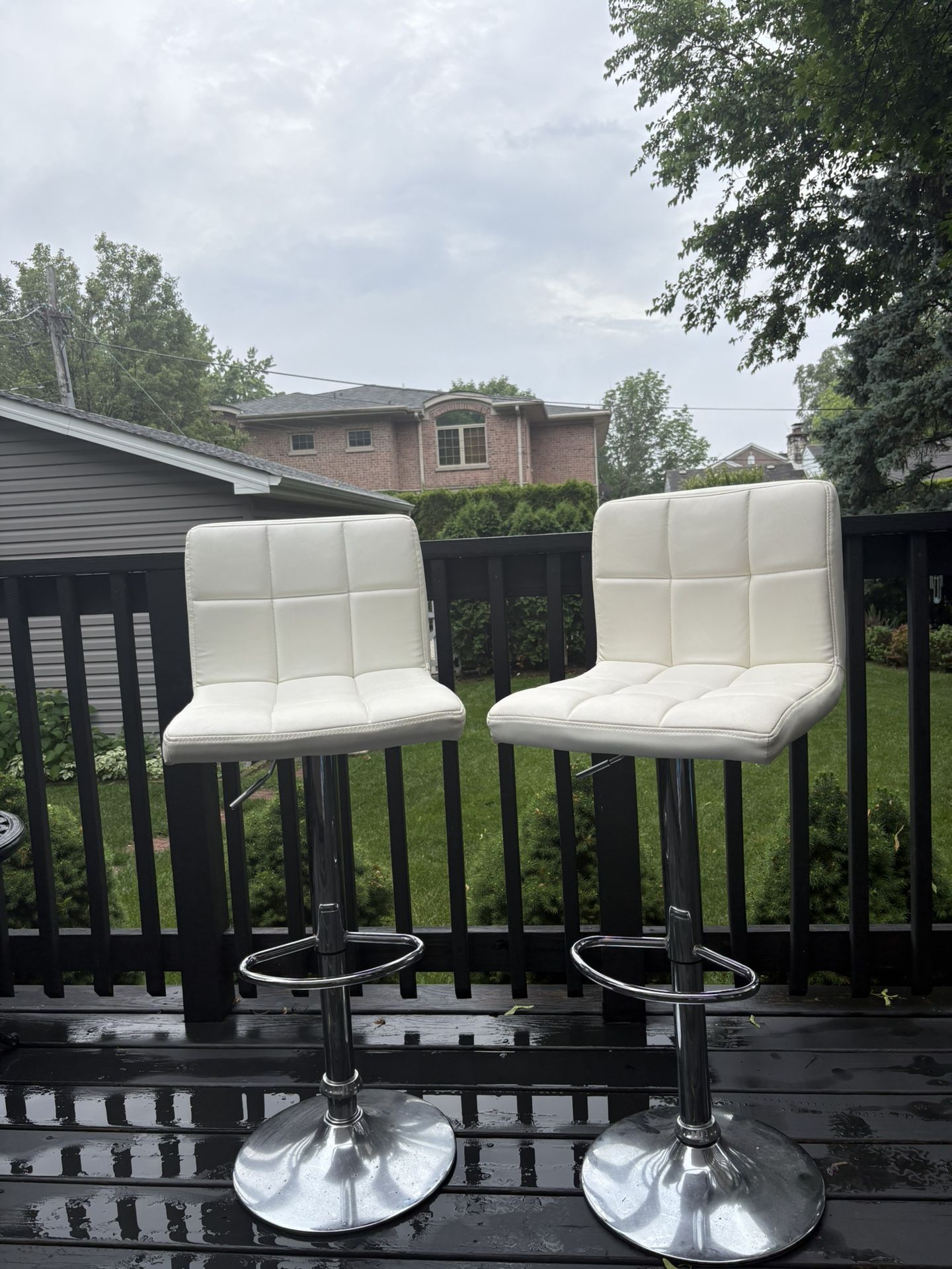 White modern bar stools with adjustable heights and spin 360 degrees. Great for outdoors or indoor home furniture. They have white faux leather.