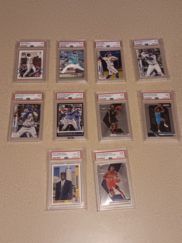 There are ten total cards in this lot. Six of them are baseball and four are basketball. The Dikembe Mutombo & Justin Williams are graded 8. The rest are graded 9. Please see all pictures for players/ details/ condition. Asking $60 for all 10.