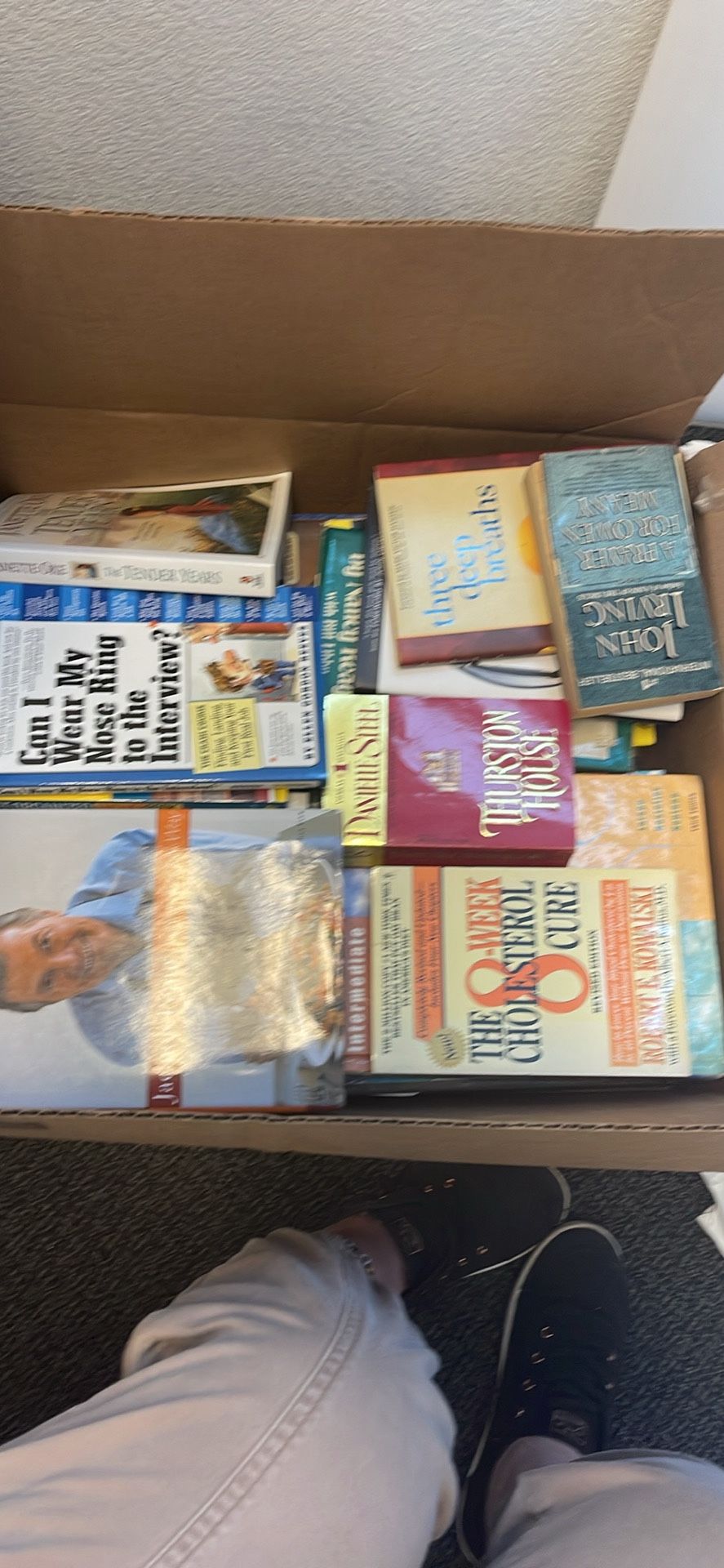 Please don’t ask me what the titles are. I have two giant boxes of mixed books and all of them are in good shape. Five dollars per box. You get what’s in the box you don’t pick and choose and you have to take the whole box with you. And it’s heavy. I was going to do a book return but they’re just too heavy to mail. And I just found them in the back of our warehouse.