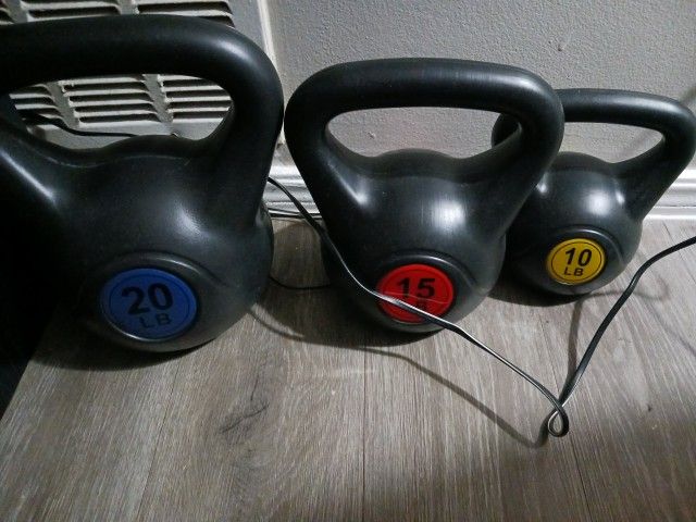 As follows: 1- 25lb kettlebell 1- 15 lb kettlebell 1- 10lb kettlebell