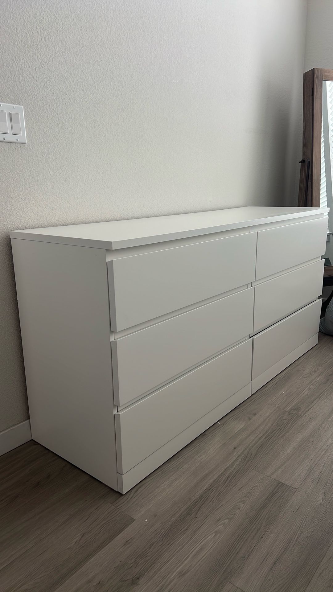 White dresser from IKEA It is the 6 drawer malm dresser from IKEA - 30.75” height, width is 63” and depth of 19”