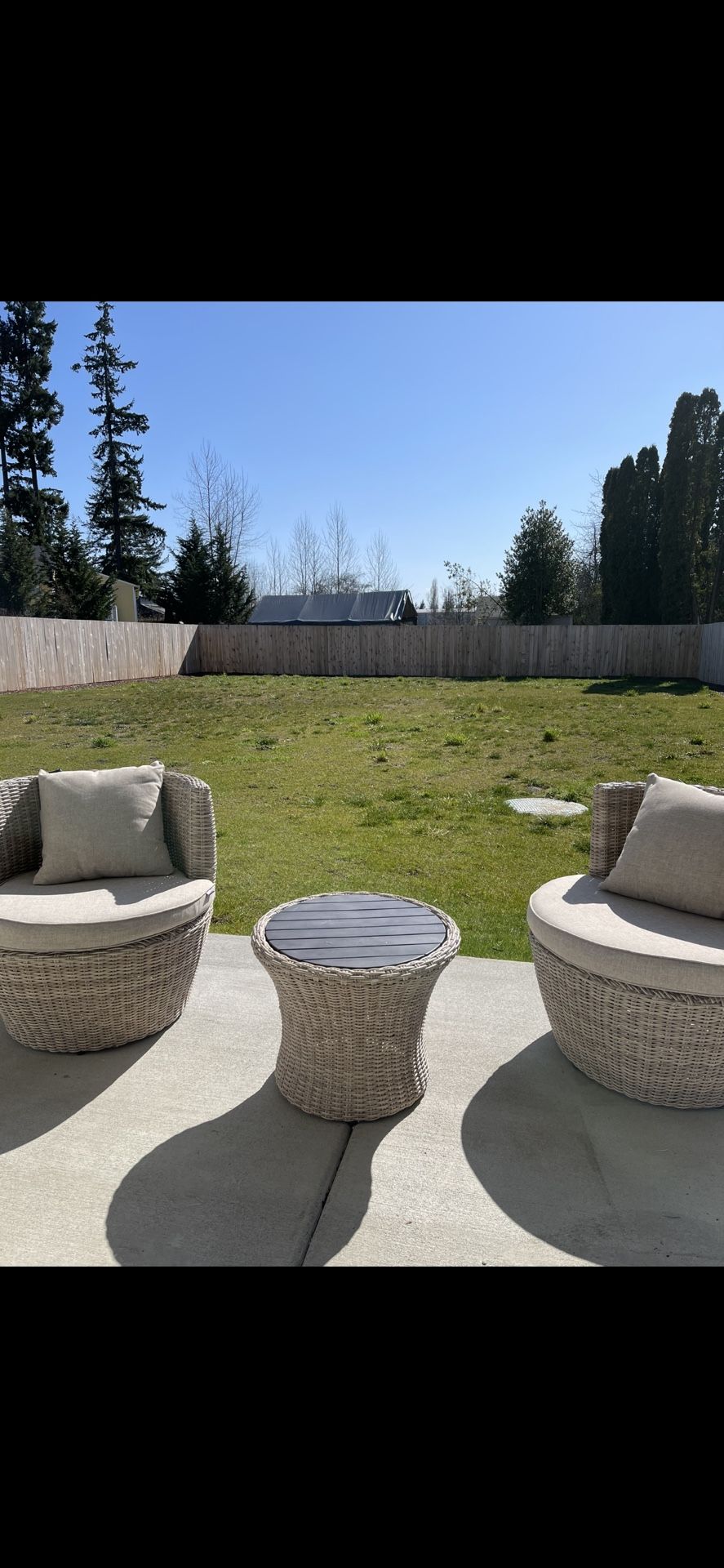 Everything is in good condition. Bought it couple months ago and it doesn’t fit well for us. Chairs are waterproof and also has covers that you can remove to wash them.