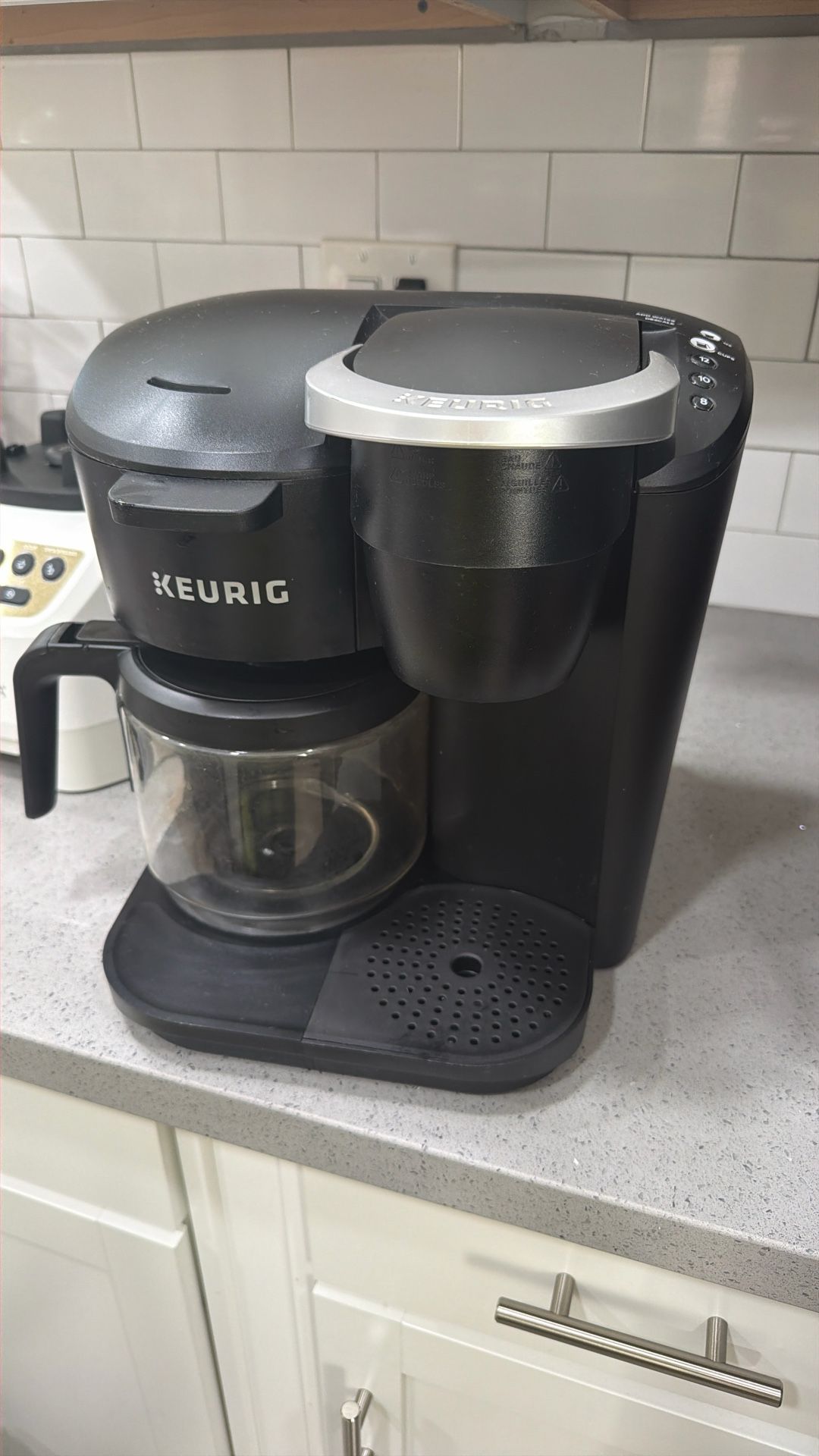 Keurig - 12 cup and individual. Glass need replacement, other than that it work perfectly fine.