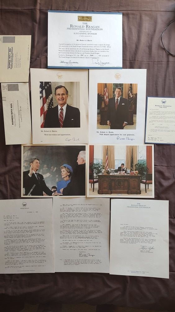 a real nice autographed pictures by President Bush and President Reagan. Two nice photos of Nancy Reagan and President Reagan. A personal letter written by Ronald Reagan. Nice little collection. All for only$20.
