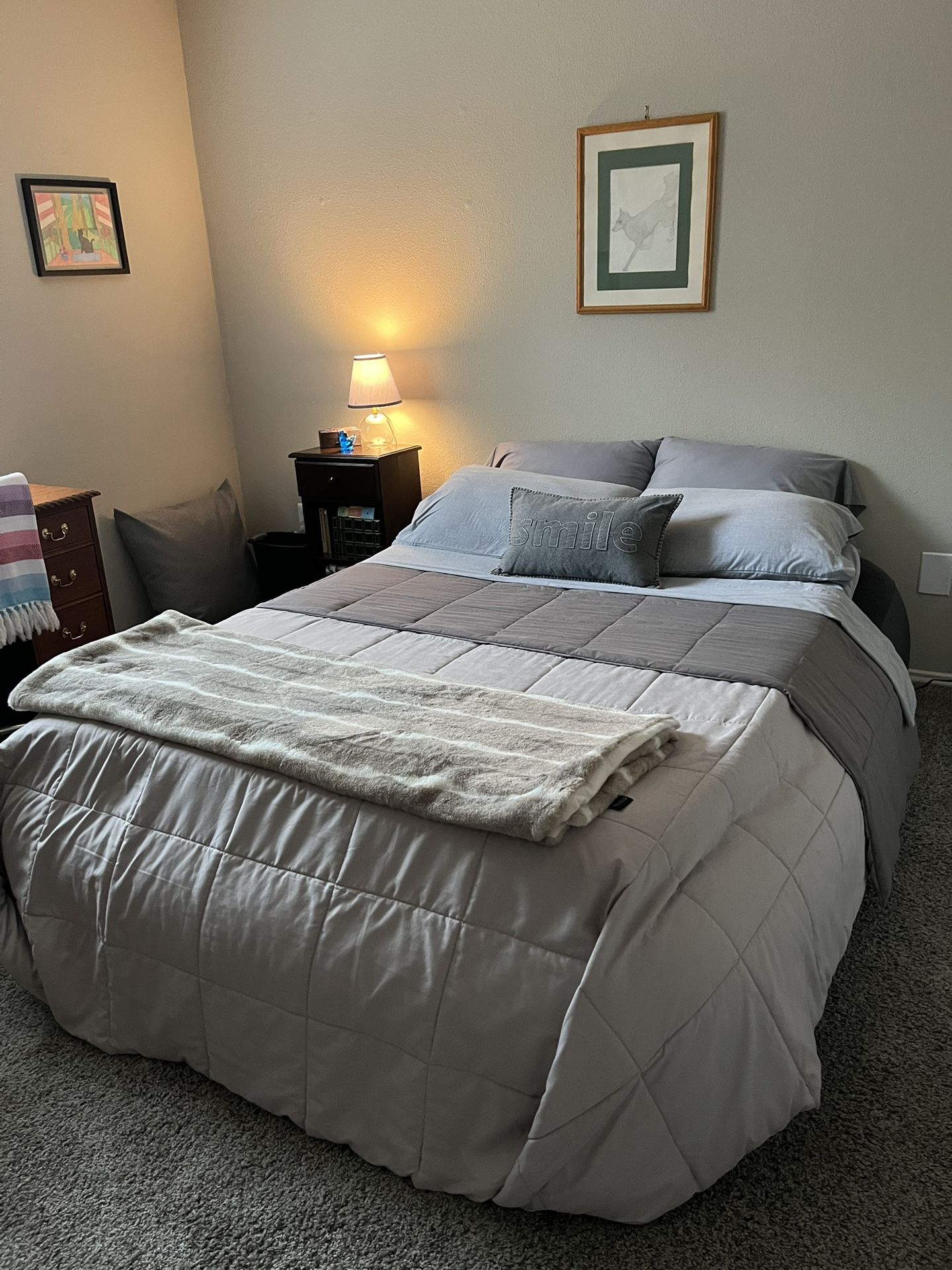 Roomy and long, this queen size inflatable bed has a built-in electric pump with firmness control. Pristine shape. We have always used a foam mattress topper, so it has never been directly laid on.