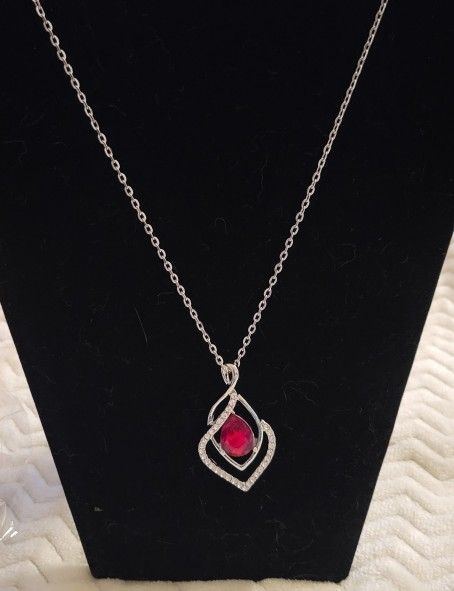 Long Silver Necklace W/ Red And Clear Crystals