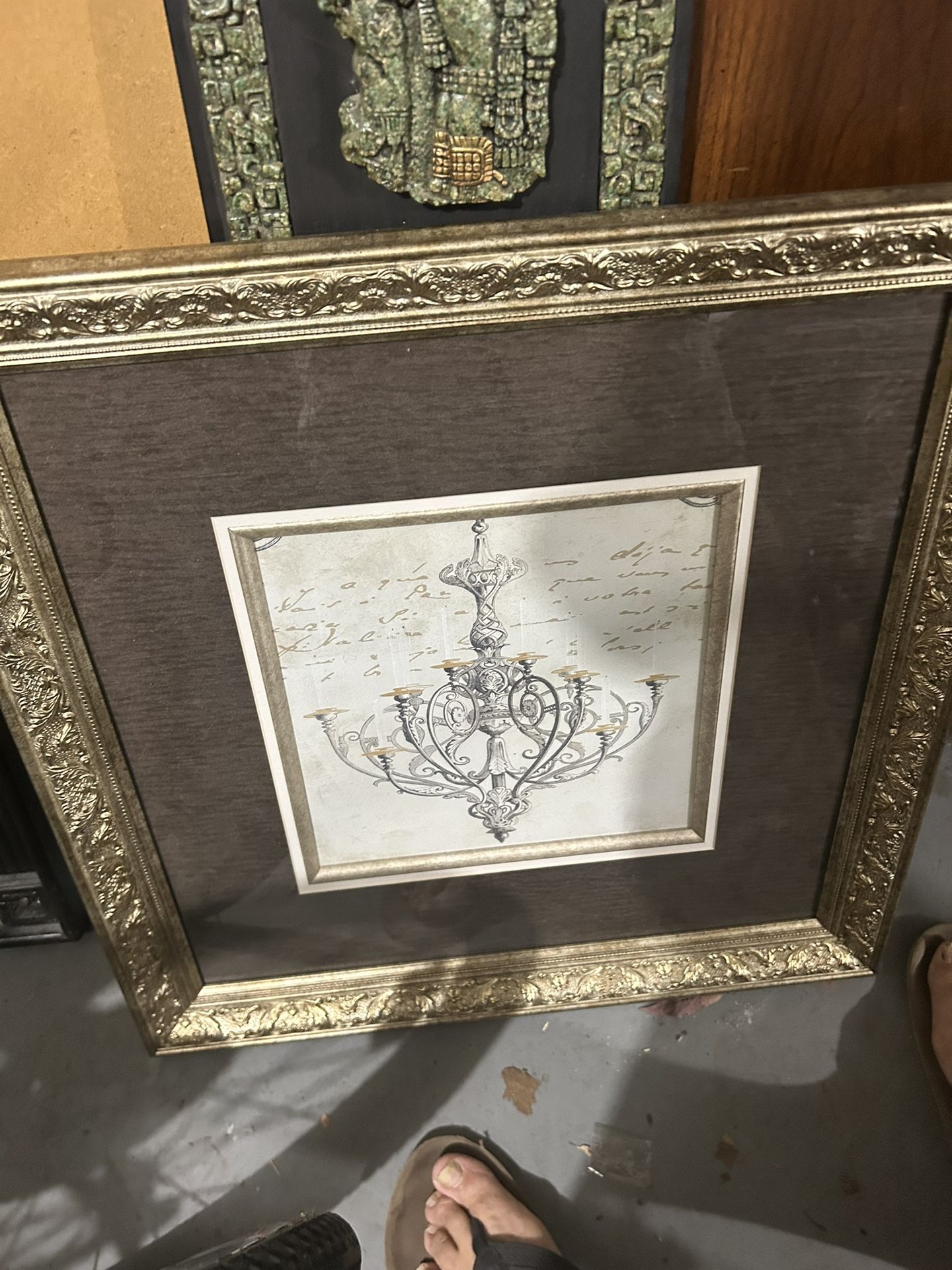 framed print of a chandelier, possibly titled "Chand 2" by the artist Color Bakery