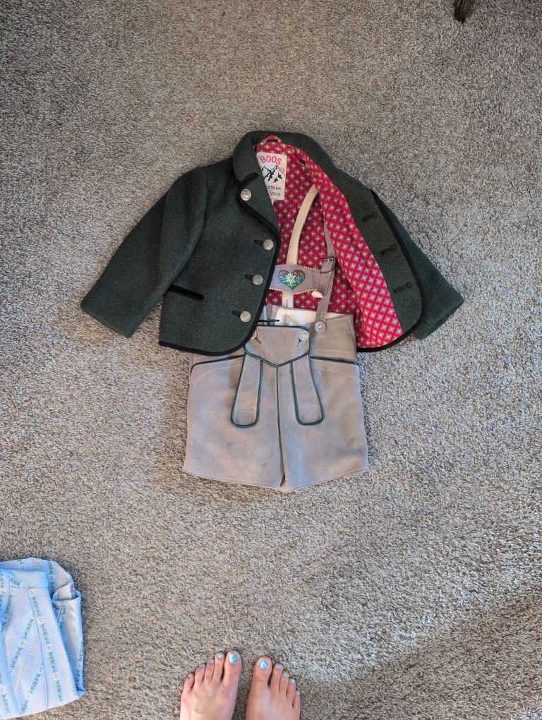 This is a real leather lederhosen paired with a green wool jacket made by BOOS in euro size 92. I'm also including a genuine Swiss shirt with a pretty edelweiss design in size 98. From a smoke free, pet-free home See photos for more details but feel free to ask any questions!