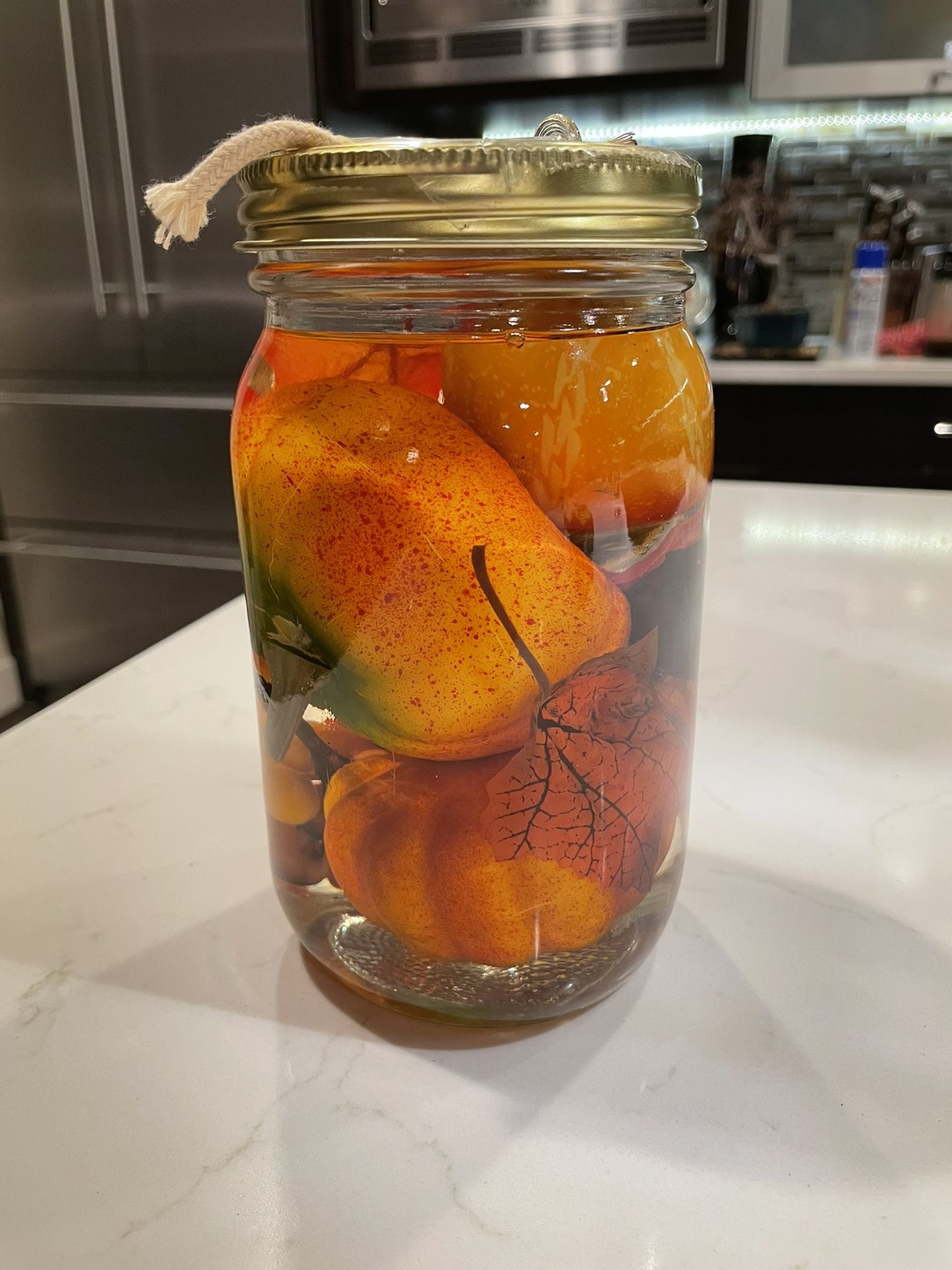 Oil and fall harvest items suspended in oil with a wick for burning in a quart mason jar
