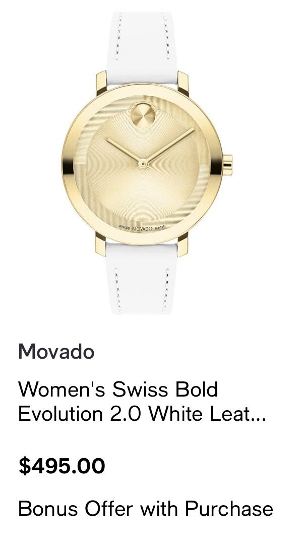 Brand new Never been worn Movado bold evolution 2.0 women’s watch Gold watch face with white genuine leather strap Waterproof up to 30m Feel free to make me an offer! Currently selling for $495 +tax Its a beautiful piece. I got this as a gift and it’s sat in my jewelry box since,it’s not my style. *Watch Box not included
