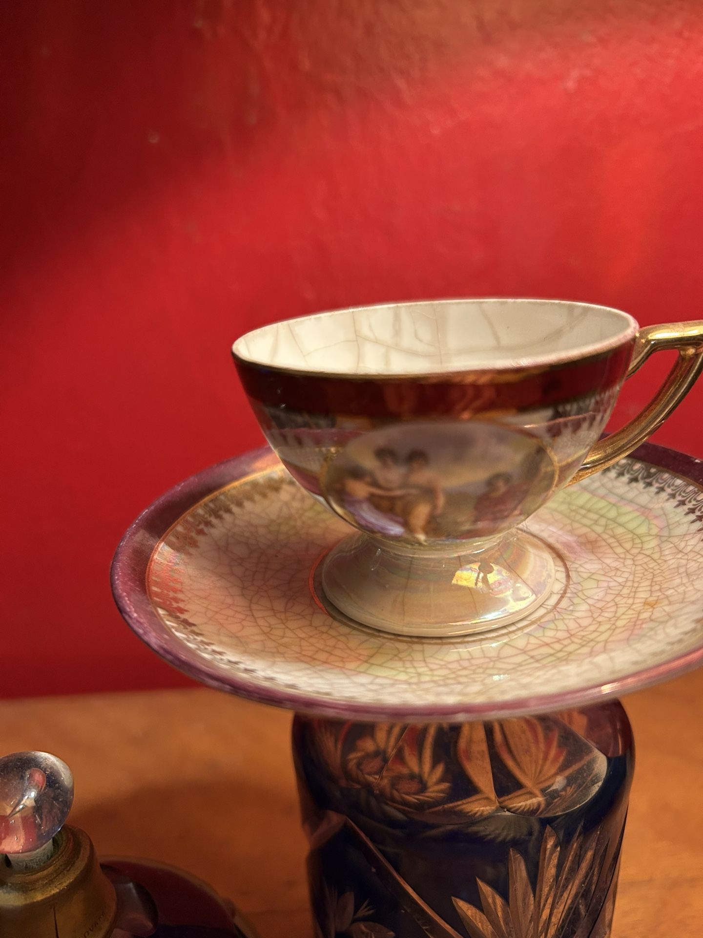 2 tazas pintadas a mano con bordes y mango de oro. Reliquia de castillo.