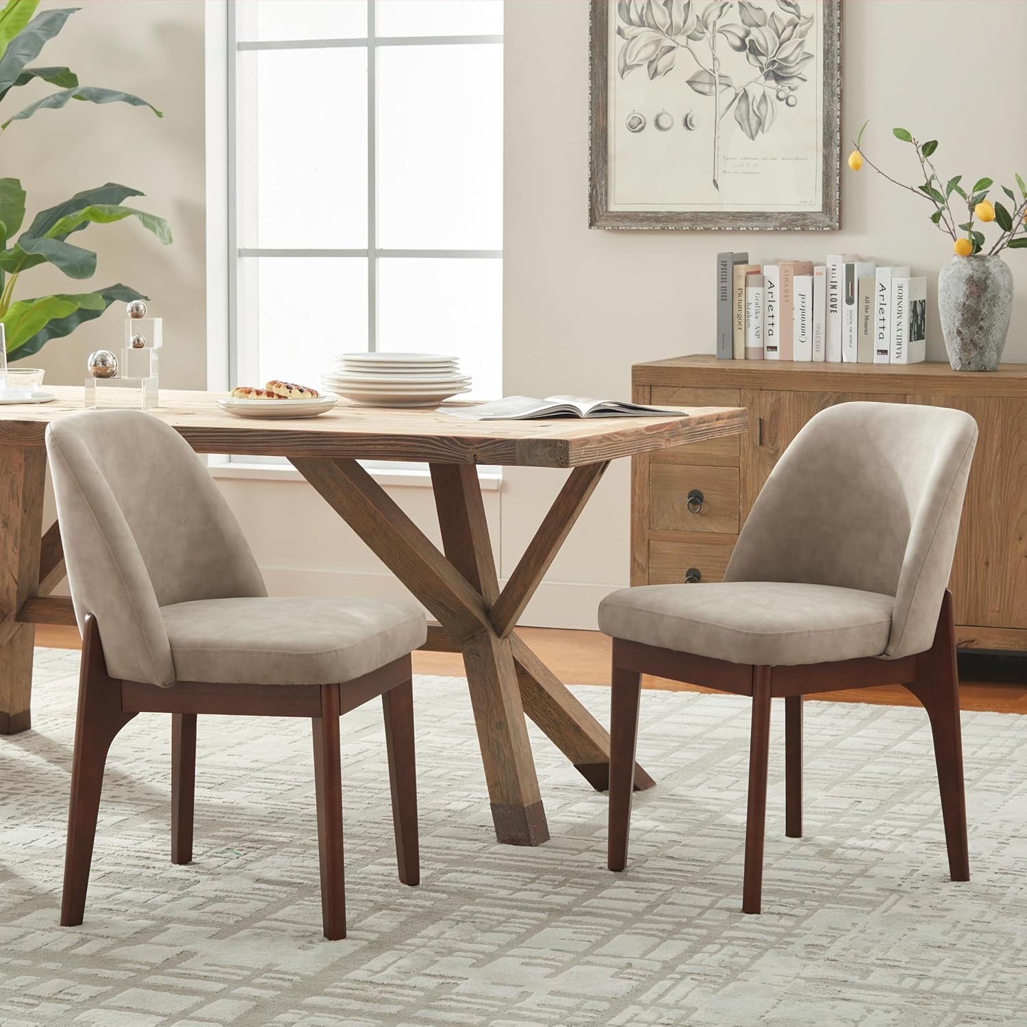 0481E Modern Dining Chairs Set of 2, Faux Leather Kitchen Chairs with Wood Legs, Upholstered Side Chair for Kitchen Dining Room, Taup